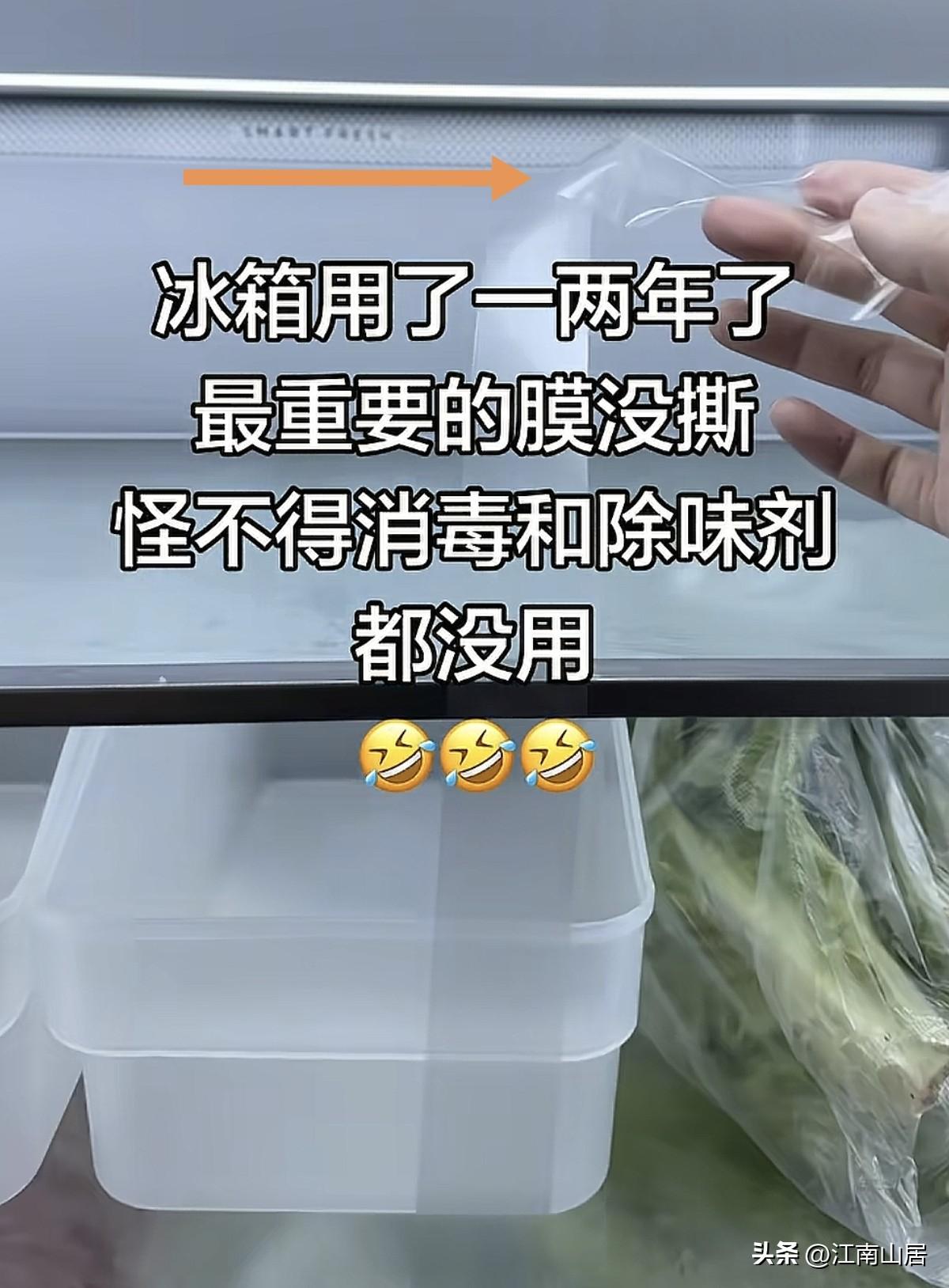 冰箱有异味,再怎么清洁,也去除不了。也有可能是忘记撕掉,冰箱内外的“除味膜”了。因为冰箱也是需要,跟外部交换空气的。需要有一定的空气对流的。 这个“除味膜”不撕掉,外部新鲜空气进不了冰箱,内部气体无法排出。那么在打开冰箱的时候,就会有异味了。 当然,冰箱有异味,是有三种情况产生的。这个内部和外部的“除味膜”,没有撕掉,是其中一种原因。 另一种就是长时间没有清洁冰箱,内部产生异味。还有一种就是放了海鲜等,味道比较重的食品,也会产生异味。 第二种和第三种情况,平常注意清洁冰箱,注意密封好海鲜,基本上可以去除异味。但是,如果不撕掉“除味膜”,再怎么清洁冰箱,都会产生异味的。