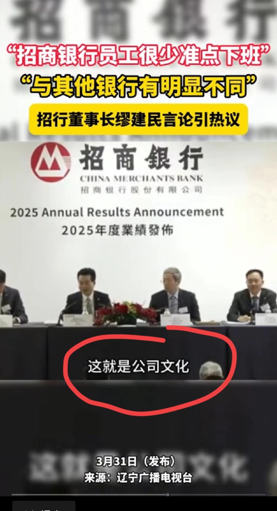 深度分析: 招商银行董事长公然说出 “我们的员工很少准点下班的,这就是我们的公司文化”。为何备受质疑! 老一辈人,可能把艰苦奋斗精神,无私奉献精神作为优良作风,没错,那时候的我们,心中有信仰,只要你肯努力,机会还有很多。我相信,招商银行董事长的本意是想表达这个。 但现在的年轻人知道,往往嘴巴上说要无私奉献和艰苦奋斗的人,他自己常常是通过关系网被提拔,他的奋斗更多的是在酒桌上推杯换盏,阿谀奉承,工作上的更多是讲一堆场面话,什么积极推动,什么实现目标,然后拍拍照,办公室做好材料,仅此而已。 因此,与其鼓励员工加班,不如建立更好的晋升通道,更优厚的福利待遇,更简化的形式主义流程,能发群的通知绝不开会,能一句话讲清楚的,绝不发文!我们要向张雪峰的公司学习,上四休三,而不是积极加班! 打工人