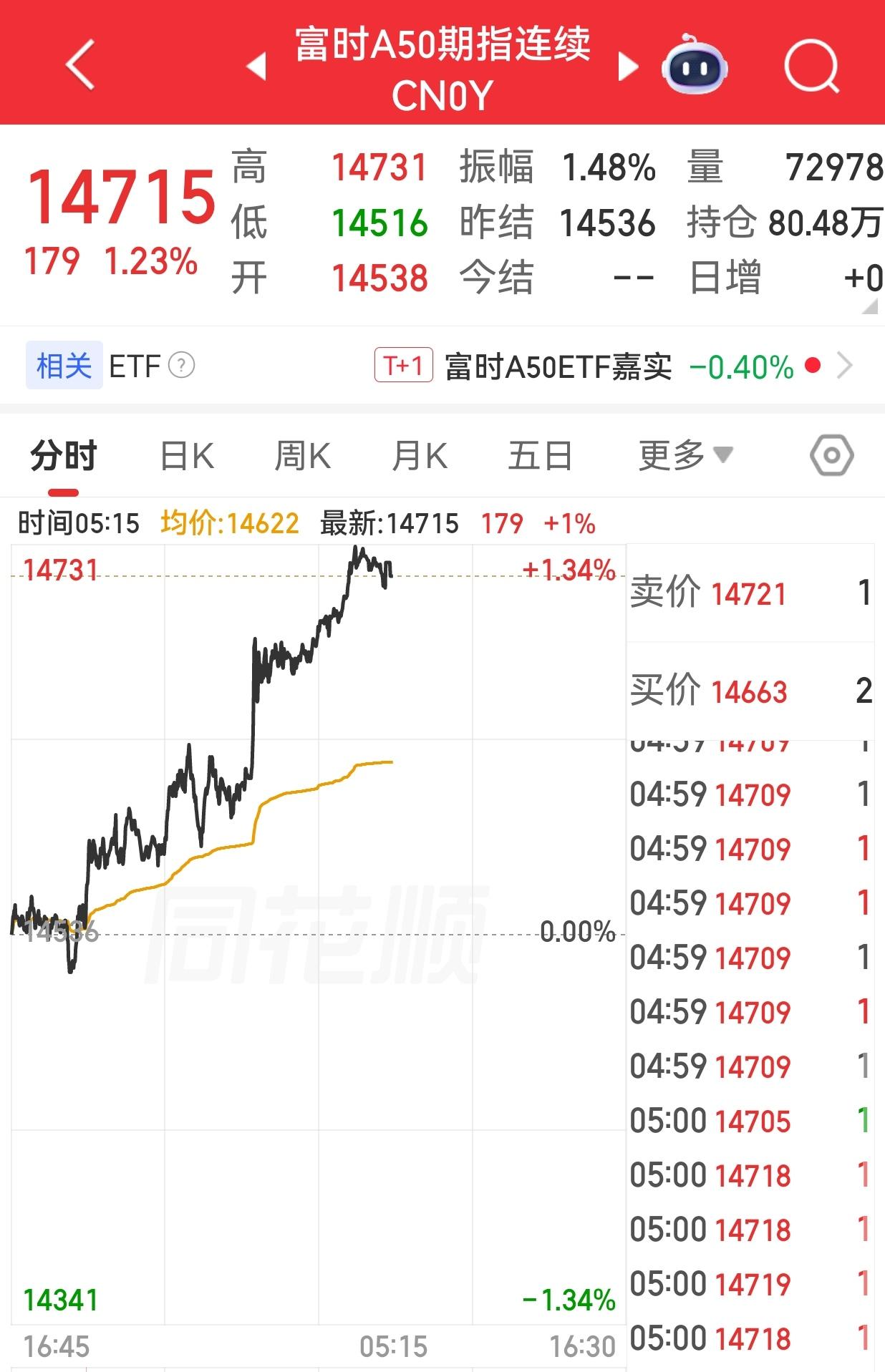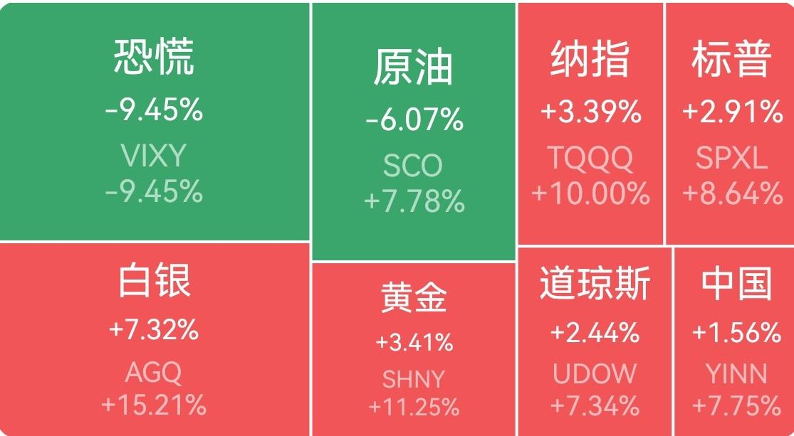 【周二外围市场:美股三大指数集体大涨 热门中概股集体走强 夜盘A50期指大涨】 周二美股三大指数大幅收涨并创下去年5月以来最大单日涨幅,纳指涨3.83%,标普500指数涨2.91%,道指涨2.49%。月线方面,纳指本月仍累计下跌4.75%,标普500指数累跌5.09%,道指累跌5.38%。科技股反弹,航空股走强,能源股回落。 热门中概股集体走高,利弗莫尔中概股龙头指数涨超3%。 夜盘富时中国A50指数期货收涨1.23%,报14715点。