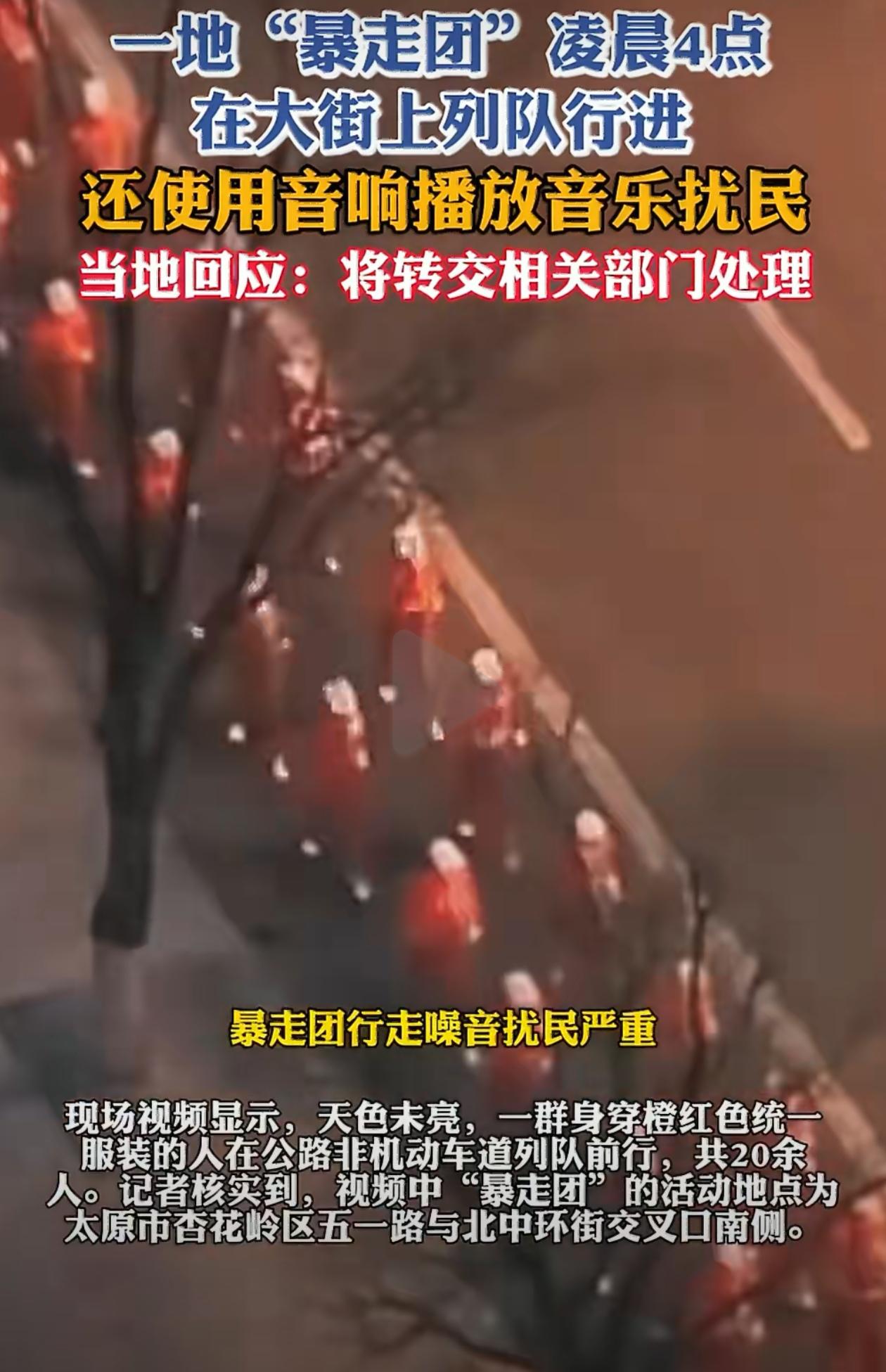 凌晨四点,哭坟都没这么早!太原“暴走团”凌晨4点在大街上列队行进,还使用音响播放音乐扰民,当地回应:将转交相关部门处理。