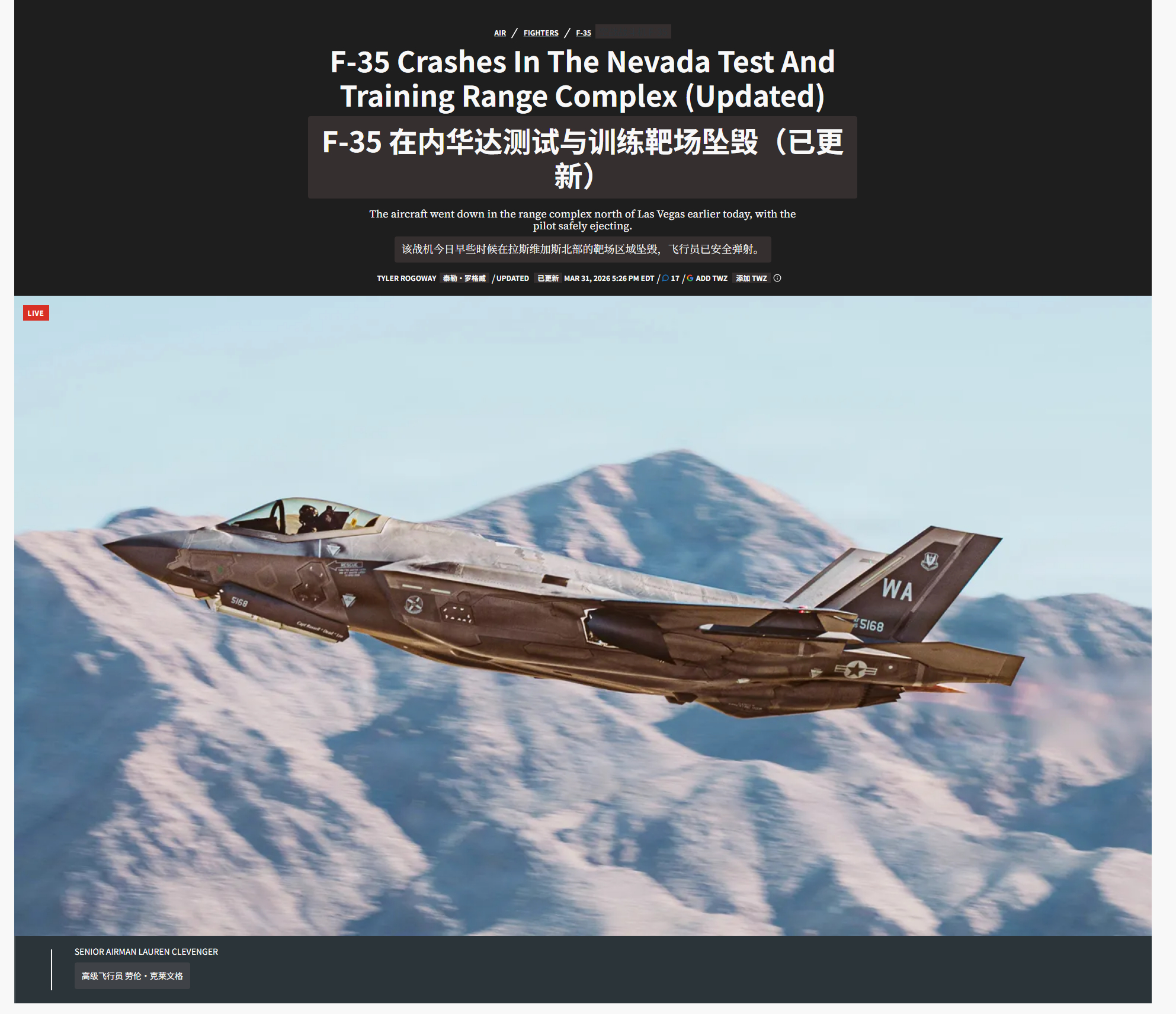 🔻突发新闻:美军称,一架 F-35 战斗机在内华达测试与训练靶场坠毁。🔻据 KSNV 新闻 3 台报道:“消息人士告诉新闻 3 台,美军正在搜寻一名周二在内华达州南部上空被迫弹射跳伞的飞行员……据消息人士称,该飞机在中午时分报告了机动故障。”该媒体随后报道称飞行员已被找到,身体状况良好。🔻稍后,内利斯空军基地第 57 联队(该靶场隶属于该基地管辖)向TWZ发来声明,声称失事的 F-35 战机隶属于内利斯基地。作为武器测试、战术研发和假想敌任务的主力机型,F-35 是该基地的重要常驻单位,同时也有多支来访的 F-35 部队频繁在此进行训练演习。🔻这么巧?伊朗称将沙特视为兄弟国家美国军人向脱衣舞女泄露部署计划海外新鲜事中东现场直击