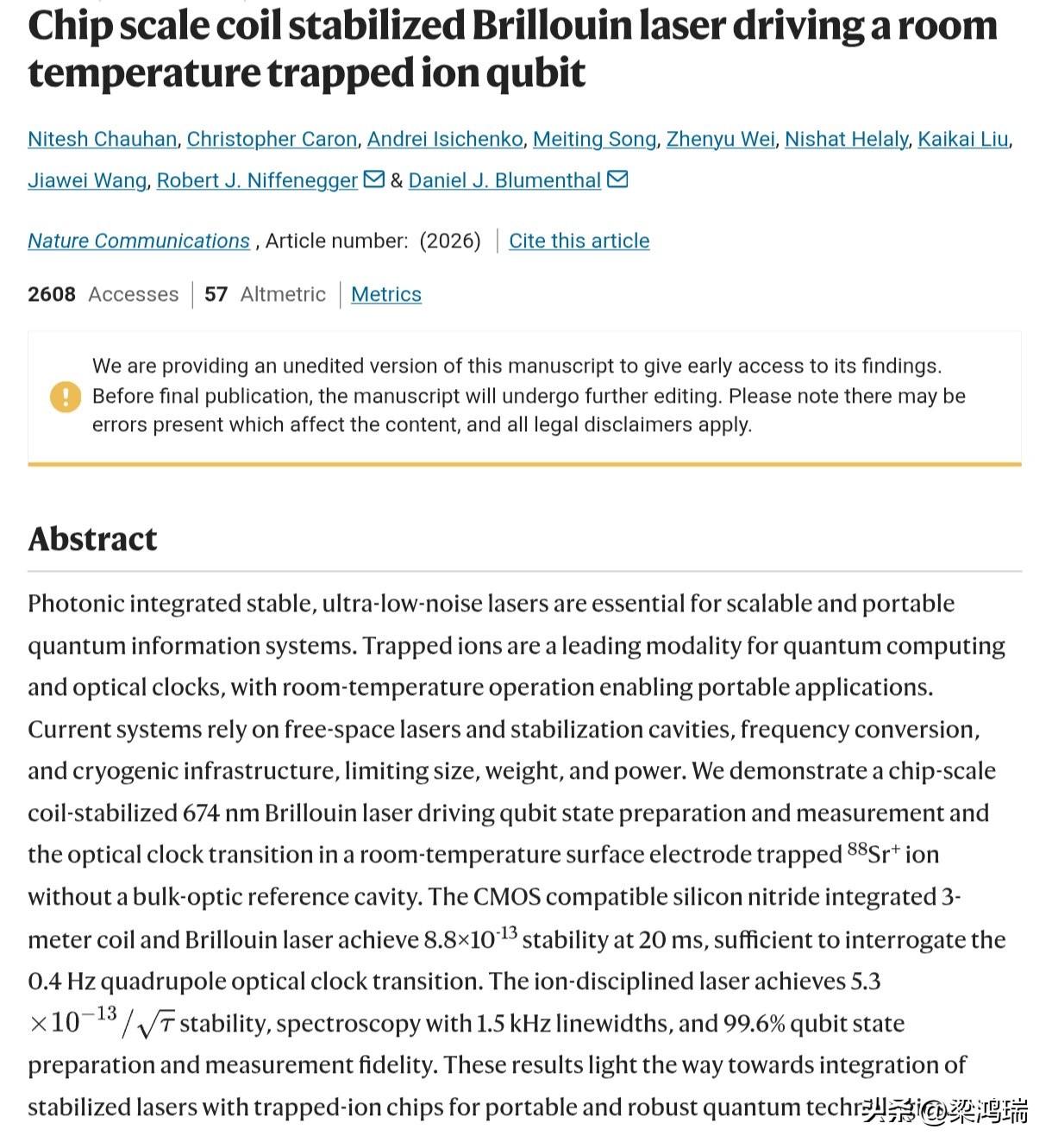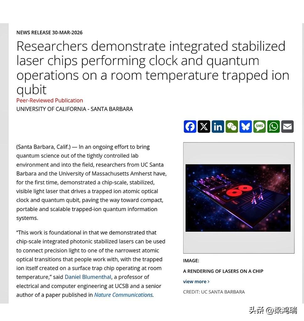 美国国家标准与技术研究院 (NIST) 及其合作者开发了一种芯片级激光器,打破了以往量子实验室对大型、复杂光学系统的依赖。 该研发团队在硅光子平台上制造出的这种芯片级 674 纳米稳频激光器,具有超高的稳定性(~8.8 × 10 ⁻ ¹³)。” “它可在室温下运行,并能控制囚禁离子量子比特,处理制备、操控和测量。” 以下是这项技术的核心价值: 极高的稳定性:8.8 × 10 ⁻ ¹³的频率稳定度意味着激光的“颜色”极其纯净且不漂移,这对于精确控制锶离子 (𝑆𝑟+) 的能级至关重要。 平台微型化:通过在硅光子芯片上集成,原本占据半张光学桌子的系统被浓缩到芯片级别。这解决了量子计算机物理体积过大(Scalability)的瓶颈。 全功能控制:它不仅是光源,还能直接执行离子阱量子比特的初始化、逻辑门操作和状态读出。 环境适应性:能在室温下稳定运行,意味着它距离商用量子计算硬件或便携式原子钟更近了一步。