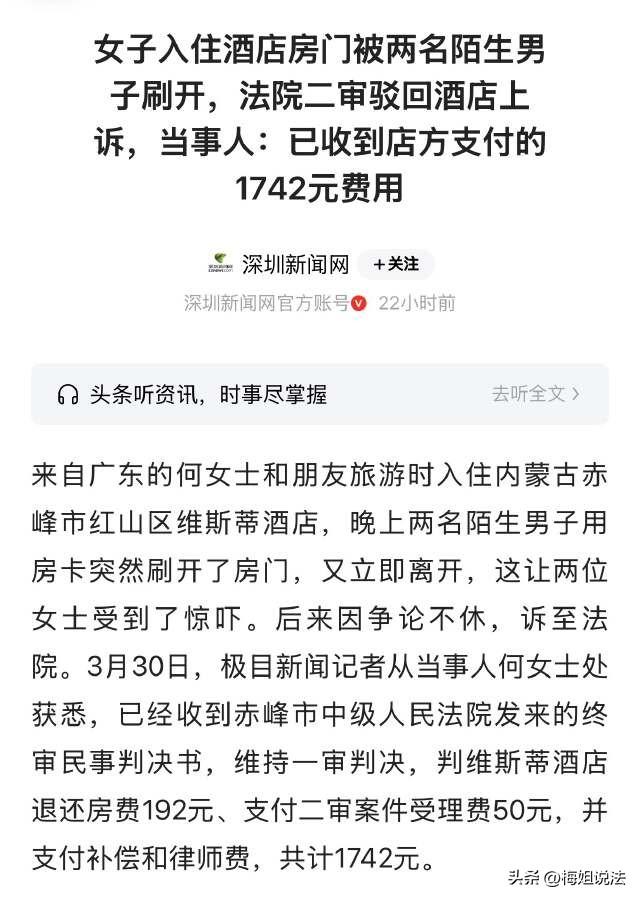 内蒙古,一女子跟朋友从广东出发,途经北京,之后去内蒙古旅游,入住酒店之后,晚上被两位陌生男子使用房卡打开房门,回头又立刻离开。女子跟朋友都惊吓不已,准备找酒店维权。酒店承诺说退房费,但是却又一直不退钱,女子感觉酒店处理态度很散漫,要求“退一赔三”。最后沟通无果,女子决定上诉维权。 深圳新闻网3月30日报道了这则新闻。 来自广东的何女士跟朋友王女士,两个人准备去内蒙古旅游,在网上预定了一家酒店,房间号是613号房。 王女士跟朋友入住之后,两个人洗漱完毕,准备休息。 谁知道,到晚上的时候,房门突然“吱呀”一声被打开,屋内的王女士跟何女士都惊吓不已,不知道发生了什么情况。 这个时候,两名陌生的男子走了进来,其中一位男子上身都没有穿衣服。 这就让房间内的两位女士很尴尬了,又是惊恐、又是羞愧。幸亏当时安全锁锁上了,两位女子过去询问:“你们想要做什么?” 听到屋内有人,两位陌生男子则立刻就离开了。 而王女士跟何女士非常恼怒,对这样的事情无法接受,立刻就找到前台理论。 前台得知这件事后,立刻派人过来测试门锁。但是酒店的工作人员却表示:是王女士没有关好门,这才导致了这个乌龙。 这个说法肯定不成立,王女士认为,酒店一方就是想要推卸责任,在她的强烈要求之下,值班经理才给出了答复。 据经理称,两位陌生男子是隔壁616房间的房客,当时他俩走错了房间,正好酒店当天的系统升级出了问题,所以王女士居住的613房间就被这两位房客刷开了。 当时经理表示,答应给王女士更换楼层房间,并且还承诺,次日退房的时候会赔付房费。 谁知道,到了第二天,王女士准备退房了,酒店的经理跟王女士互相添加了好友,但是后续却迟迟不肯退房费。 王女士认为,他们的处理态度太懒散了,是不是故意推脱,根本就不想赔偿呢? 据此就跟经理理论,并且要求“退一赔三”。 谁知道,这个要求提出来之后,经理给出的答复是,底下的员工也不容易,会以个人名义,给王女士转200元。 这位经理两次转钱,均被王女士给退回了,后来一直协商沟通都没有结果,王女士认为,酒店没有尽到安全保障义务,应该承担法律责任。 之后王女士就把这个经历给挂到了网上,酒店也在网上发布声明,双方引发了口水战。 最后,何女士就把这家酒店给上诉了,要求维权。 经过一番审判,相关部门在审定的时候认为,这家酒店提供的服务存在一定程度的瑕疵,判决酒店要退还房费192元,并且支付补偿赔偿、支付上诉费用,合计1692元,包括二审的50元,酒店需要赔偿1742元。 庭审结束后,何女士收到了酒店这边转来的1742元。 何女士表示,一行人都是女士,但是酒店安全管理却不到位,幸亏门后锁上了安全锁,不然被两位陌生男子闯入,还不知道后面会发生什么事情呢。 所以她们一定会积极维权,法律总会给他们一个公正的处理方案。 而观察酒店这一方的责任,因为系统漏洞,导致他人的房卡可以打开王女士的房间,属于未尽到安全保障义务,应该依法承担相应的赔偿责任。 根据《民典法》第1198条规定,宾馆作为经营场所的管理者,负有对客人人身与财产安全的保障义务。 酒店因为房卡系统升级出现故障,竟然导致其他房客的门卡,能够打开女士的房间,这个已经构成了明显的管理疏漏。 即便没有造成实际侵权,但是隐秘的空间被非法侵入了,这个风险已经对住客造成了心理恐慌跟隐私威胁,顾客有权要求酒店退还房卡、给予经济补偿,甚至还可以主张精神损害赔偿。 当房客个人的权益遭受侵犯,可以积极维权,将自己受侵害的证据保留下来,包括监控记录、沟通录音、书面声明,后期可以走上诉途径推动问题的解决。 虽然王女士最后没有得到“退一赔三”的支持,不过相关部门判定时,第一要求酒店退还全部房费,第二要求酒店做出500元的经济补贴赔偿,第三酒店还需要承担诉讼的相关费用。 其实已经表明,王女士、何女士维权成功了,他们的合法权益应该得到法律的肯定与维护。 对于此案,你怎么看呢?