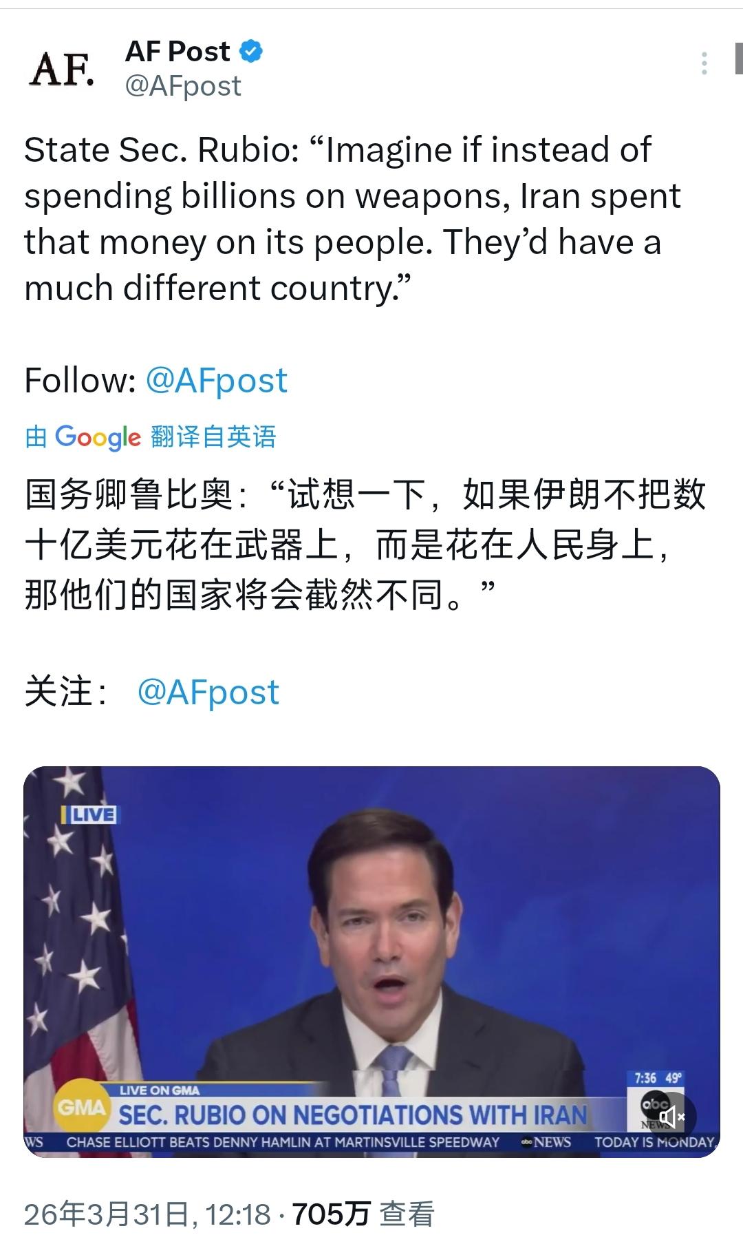 伊朗议会议长卡利巴夫今天(北京时间4月1日)发文写道: “‘如果他们不把钱花在武器上.....’ 那该有多美好......然后我们就可以进去,48小时内占领他们所有的油田相信我,只要48小时给以色列人配备最好的武器,然后建立起无数个新的加沙地带。这才是真正的‘美国梦’,伙计们。 绝不!” 【卡利巴夫转发了美国国务卿鲁比奥的讲话:“试想一下,如果伊朗不把数十亿美元花在武器上,而是花在人民身上,那他们的国家将会截然不同。”】 [机智]评几句:鲁比奥站在道德制高点指责伊朗将资金用于武器而非民生,却对美国常年向以色列输送海量先进武器、为其中东霸权撑腰的事实视而不见,更对自身动辄发起制裁封锁、掐断伊朗经济命脉、让伊朗民生举步维艰的行径讳莫如深,若无美国的极限施压,伊朗何需倾尽财力寻求自保? 当然,伊朗也确实需正视民生发展的迫切性,常年的对抗与博弈让国内经济承压、民众生活受影响,民生建设的滞后已是亟待解决的现实问题。 此外,伊朗的博弈思维在我看来是有问题的。我说的就是拥核。伊朗是希望用不发展核武器,去跟美国博弈。即:我有能力去浓缩铀,但我不这样做,你美国能不能对我解除封锁?但事实上,你不能拿着一个没有的东西去谈判。站在伊朗的角度,他应该不惜一切去发展出这个东西,再去谈判,空有筹码雏形却无实际底牌,终究难以在与美国的博弈中掌握真正的主动权。