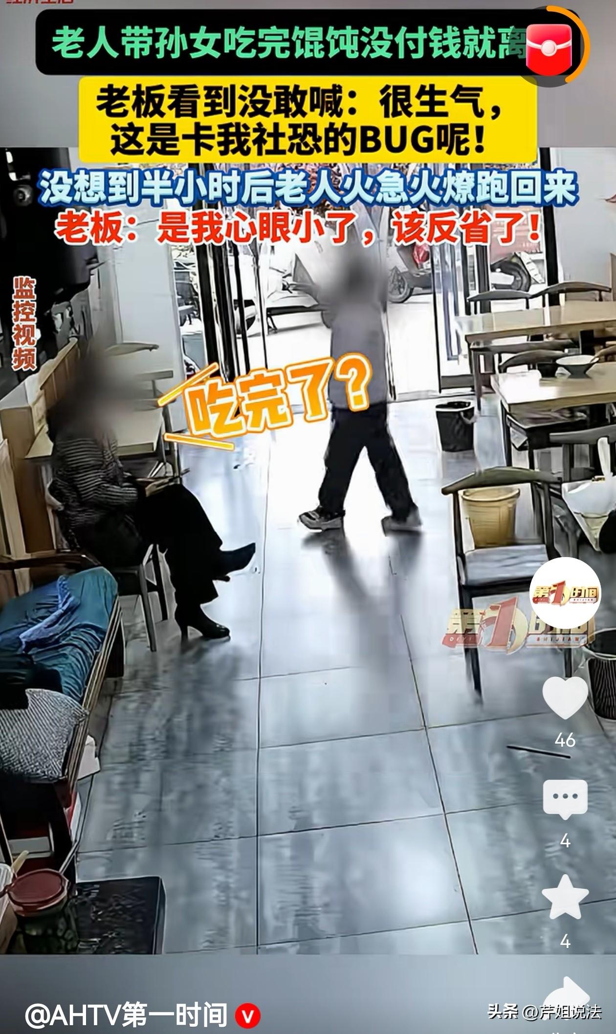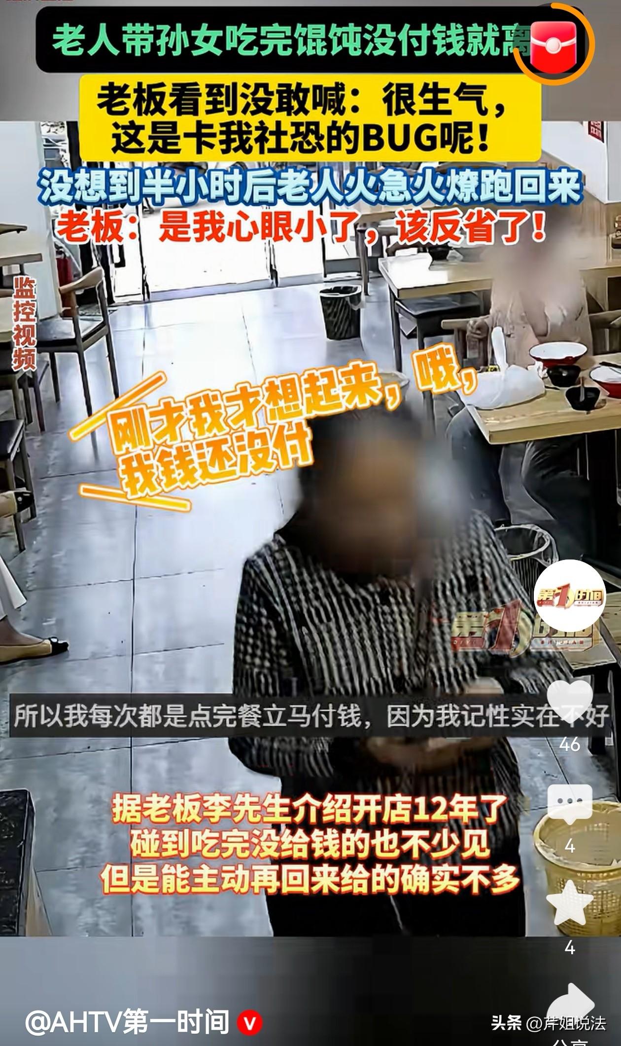 安徽巢湖,一位阿姨带着孙子去吃馄饨,吃完也不付钱,领着孩子抬屁股就走了,由于当时店内还有其他顾客,老板也在忙,顾不得去追着阿姨要钱。万万没想到啊,过了一会,这阿姨又回来了,原来刚才阿姨只是忘了付钱,并没有想逃单。老板说他干了这么多年买卖,见过忘付钱的,但忘了付钱还回来补的真不多见。自己也为刚才错怪阿姨而感到羞愧。 李先生开了一家馄饨店,这个小店已经开了12年了,来吃饭的多数是附近居民。偶尔也有途经的路人。 开了这么久的店,他见过形形色色的人,拿东西来换饭的,来给推流做宣传的,吃完饭逃单的,甚至有来要饭的,还有不要找零钱的,见得多了,他也不觉得奇怪。 这天,跟往常一样,店里客人不算多,但自己也没闲着,一直在厨房忙碌。 快中午时分,来了一个阿姨,带个孩子来吃饭,李先生抬头看一眼,这阿姨好像有点眼熟,但也不是特别熟的那种,应该也是来过店里消费。 李老板问:来点什么? 阿姨说:给孩子来一碗大碗馄饨,一份就行,我不吃。 李老板回答:好哩! 做好馄饨后,李老板端上来,放到孩子面前。 孩子应该也是饿了,大口大口的吃,吃的很香。 见顾客吃的好,李老板也很开心。 不是饭点,店里的顾客稀稀拉拉,李老板在厨房忙碌之余也能看两眼餐厅内客人的情况。 他刚一抬头,正好看见阿姨带着孙子走了,碗里的馄饨吃的溜干净。 李老板迅速回想了一下,阿姨还没给钱呢! 这时候店里还有人,碍于面子,他也没出去追着要。但心里还是很气愤。 生气归生气,店里还有其他客人,不能不管。 李老板想要不要在墙上贴个提示,上面写上:小店生意,利润不多。来店顾客,请先付款,再用餐,谢谢配合。 他在脑海里琢磨着怎么写这个提示比较好。 正想着,一个人影匆忙跑进来。李老板一看,这不刚才逃单那阿姨嘛,怎么自己又送上门了! 还没等自己开口,阿姨先说话了。 “刚才忘记付款了,多少钱,小伙子,15元对吧?” 李老板愣了一下,回过神赶紧说:“是的,15元。” 扫码付完钱后,阿姨又匆匆忙忙离开了。 李老板这个懊恼啊!原来是他错怪阿姨了,阿姨这是真忘了,一般就算当时忘了,过去了也就那么地了!谁还来专门把钱送过来! 阿姨这品格真的没的说,该怎么形容呢,有点类似于拾金不昧吧! 瞬间李老板觉得是自己格局小了,就算一旦不给钱又能怎样呢?一顿馄饨,既赚不了大钱,也赔不了买卖。 李老板打消了在墙上贴提示先付款再用餐的想法。他说要自己反省一下,把格局打开。 他还打趣自己说道,怪不得这么多年,自己一直开的小店,这么斤斤计较,怎么能把生意做大。 这件事不大,但让人觉得很温暖。生活中我们谁都有忘记事情的时候,但一般都得过且过了,这位阿姨的“较真”是有温度的,也让很多人能够自我反省。 民法典第595条:买卖合同是出卖人转移标的物的所有权于买受人,买受人支付价款的合同。 在饭店每吃一顿饭,我们就相当于履行一次合同。卖家把食物做出来,我们吃了并付款,合同完成。 这个事件中,阿姨刚吃完饭忘记付款,属于没有履行合同,实际上已经侵犯了店主的合法权益。 民法典第626条:买受人应当按照约定的数额和支付方式支付价款。 阿姨想起来后,又回来把钱补上,履行了民法典第626条的支付义务,至此合同完成。 民法典第7条:民事主体从事民事活动,应当遵循诚信原则,秉持诚实,恪守承诺。 生活中,人与人交往过程中,我们不知不觉都在从事民事活动。 在外边吃的一顿饭,看的一场电影,去的一次公园,这些其实都是在履行合同。 虽然我们没有真正的去签合同,但这些活动都受法律保护,也要求我们在活动中要诚实守信,恪守承诺。 事件中的阿姨是我们的榜样!生活中的每一次善意都会有善意的回报! 大家对此事怎么看?欢迎留言评论。
