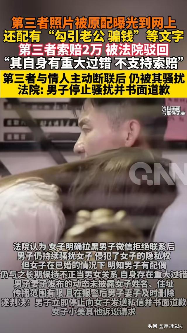 太嚣张了!安徽,已婚女子和已婚男子发展为男女朋友关系,不久事情败露,男方原配老婆在网上曝光了他俩的事,过了一会又删掉了,可事情还是传到女子的耳朵里,女子大怒,起诉原配要求道歉,并赔偿她20000元精神损失费。 小美和小王的事要从2023年说起,青岛新闻网报道了这起纠纷。 2023年,已婚的小王和同样已经有丈夫的小美阴差阳错认识了,两人认识后,都觉得对方挺有魅力,双方就像磁铁一样相互吸引,同年9月就发展为了男女朋友关系。 当时小王知道小美已经有丈夫了,小美也知道小王家里有个妻子,但是爱情来了,谁也挡不住,两人不管不顾,每天一有空就溜出去约会见面。 谈恋爱是要花钱的,尽管两人小心掩饰,可小王的妻子还是发现了不对,小王拿回家的钱越来越少,对她和孩子越来越敷衍。 2025年7月,小王老婆发现小王偷偷给小美发红包转账的事,两人的不伦之恋被发现了,小王的老婆和他大吵一架,要和他离婚。 事后,小王偷偷联系小美,将这件事告诉了她,试探着说,他想离婚和小美在一起。 小美顿时毛骨悚然,她有老公有孩子,从来没有想过抛夫弃子和小王在一块。 和小王在一块虽然开心,但这是因为小王自己有老婆,如果他是单身,自己是绝对不会和他成为男女朋友的。 小王嘴上这么说,但是也没想过真的离婚,只是他和小美在一起将近两年,为她花了不少钱。 小王觉得,男人有本事,就得家里一个外面一个,况且他已经习惯了回家老婆孩子热炕头,出门红颜相伴的生活了,妻子和小美哪一个他都不想放弃。 可让他没想到的是,小美担心自己和他的事捅到婆家,火速切断了和小王的联系,将他的所有联系方式都拉黑了。 小王没想到,他竟然成了被甩的那一个,小美越是不理他,小王的失落感越重。 他想尽办法联系小美,其他联系方式都被拉黑了,他竟然用支付宝向小美发好友申请,甚至一直给她留言纠缠。 小王的妻子原本看在孩子的面上,想给他一个机会,可小王每天魂不守舍的,小王妻子一看他的手机,发现他和小美还没断联。 气愤之下,小王的妻子直接曝光了小美的照片,还发布了一组动态,说小美勾引她的老公小王,还骗小王的钱。 动态发出去之后,很快就有熟人看到,转发给了小美,小美吓得战战兢兢。但是这事还是被小美的婆家知道了,小美家也变得鸡飞狗跳,导致她在婆家的地位一落千丈,再也抬不起头。 小美非常气愤,觉得自己遭遇的一切,都是因为小王一直纠缠自己,以及小王老婆曝光自己导致的,于是一不做二不休,竟然将小王及小王老婆起诉了。 小美要求小王停止纠缠自己,向自己赔礼道歉,同时要求小王妻子删除动态,公开向自己道歉30天,并要求小王夫妻俩赔偿她精神损失2万元。 那么本案从法律角度应该怎么分析?小美的诉求是否会得到支持呢? 可以肯定的是,不管是小美还是小王,或者是小王的妻子,在此事中都存在过错。 首先,小美明知小王已婚,还和他发展为男女朋友关系,这种行为违背了公序良俗。 公序良俗就是公共秩序和善良风俗,《民法典》第八条明确规定:民事主体从事民事活动,不得违反法律,不得违背公序良俗。 小美插足他人婚姻,破坏了小王的家庭,自身存在重大过错。 小美拉黑小王之后,小王本应该反思自己的行为,及时回归家庭,可他不仅没有意识到自己的不对,反而百般纠缠。 《民法典》第一千零三十二条规定,自然人享有隐私权,任何组织或者个人不得以刺探、侵扰、泄露、公开等方式侵害他人的隐私权。 小王被拉黑后,持续不断骚扰小美,甚至给她发威胁偏执信息,这种行为侵犯了小美的隐私权。 至于小王妻子曝光小美的照片,并使用贬义词指责小美一事,也在一定程度上侵犯了小美的隐私和名誉。 《民法典》第一千零二十四条规定,民事主体享有名誉权,任何组织或者个人不得以侮辱、诽谤等方式侵害他人的名誉权。 所以,小王妻子私自曝光小美的照片,确实在一定程度上侵犯了她的名誉权,不过,小王妻子作为事件中的受害者,做出这种行为情有可原。 最终,一审认为,小王在被拉黑之后,长期纠缠骚扰小美,侵犯了小美的隐私权,责令小王立即停止,并向小美道歉。 小王妻子虽然曝光了小美的照片,但没有透漏她的姓名和住址,并且很快就删掉了,传播范围较小,并未对小美的名誉权造成实质侵害,因此责令小王妻子向小美公开道歉30天。 至于精神损害赔偿,小美没有证据证明自己遭受了严重的精神损害,不予支持。