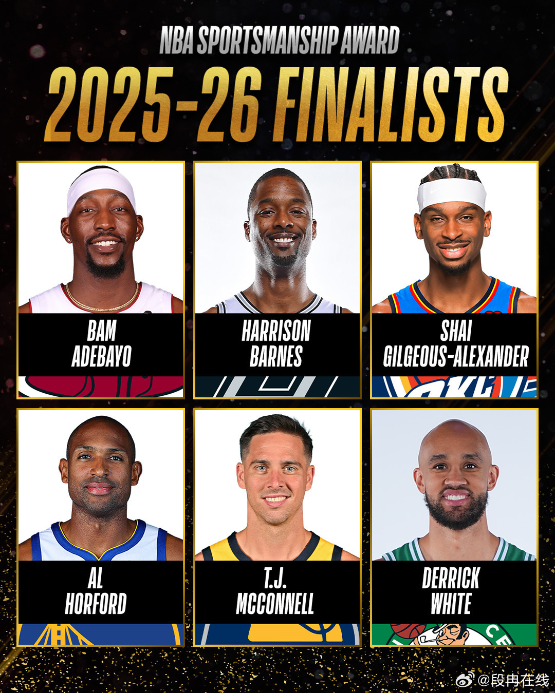 阿德巴约,巴恩斯,亚历山大,霍福德,麦康奈尔,怀特入选本赛季体育道德风尚奖入围名单。
