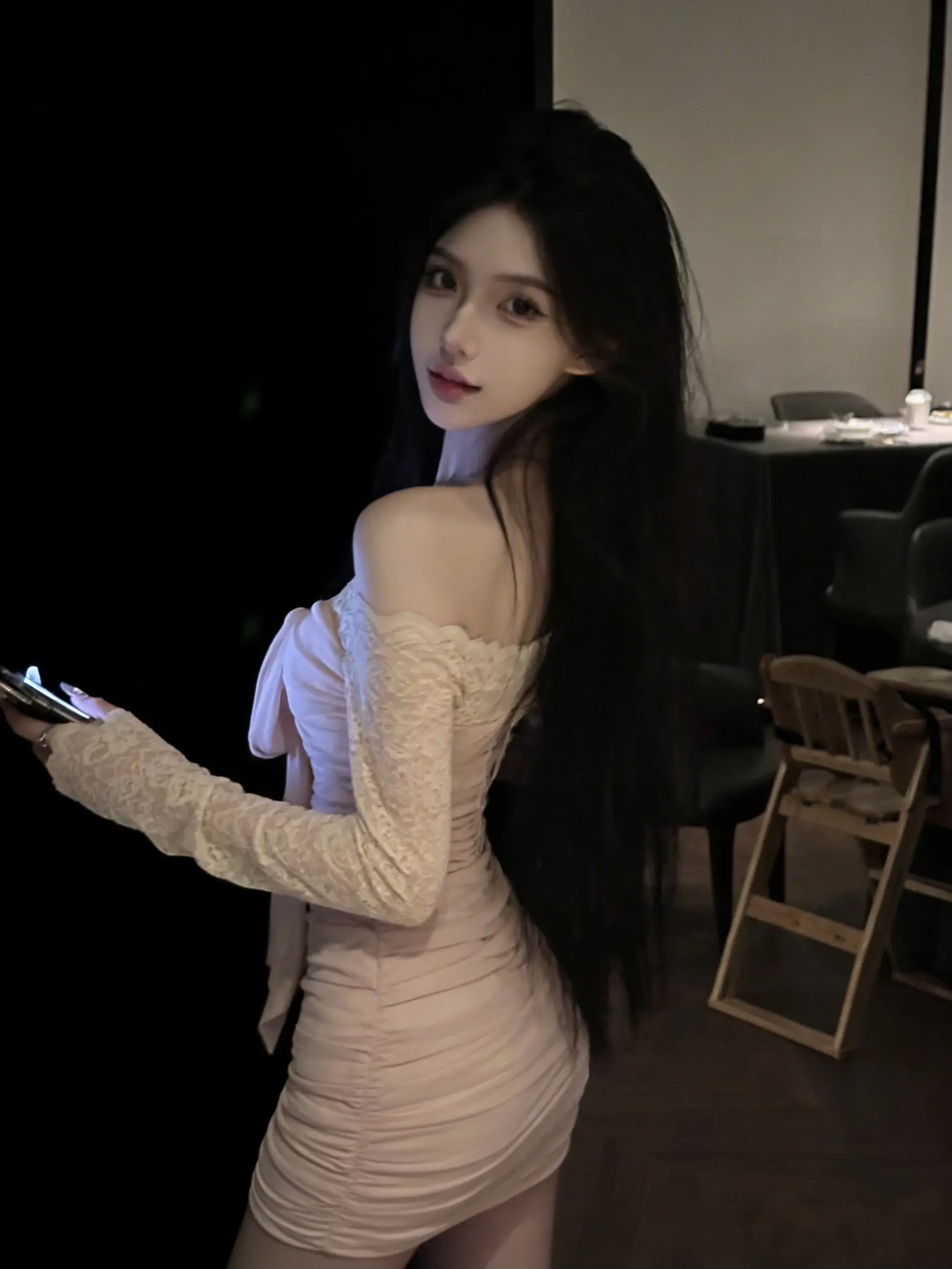一袭长裙的御姐型美女,那气场简直绝了。就说穿搭,黑色丝绒包臀紧身长裙配黑色缎面吊