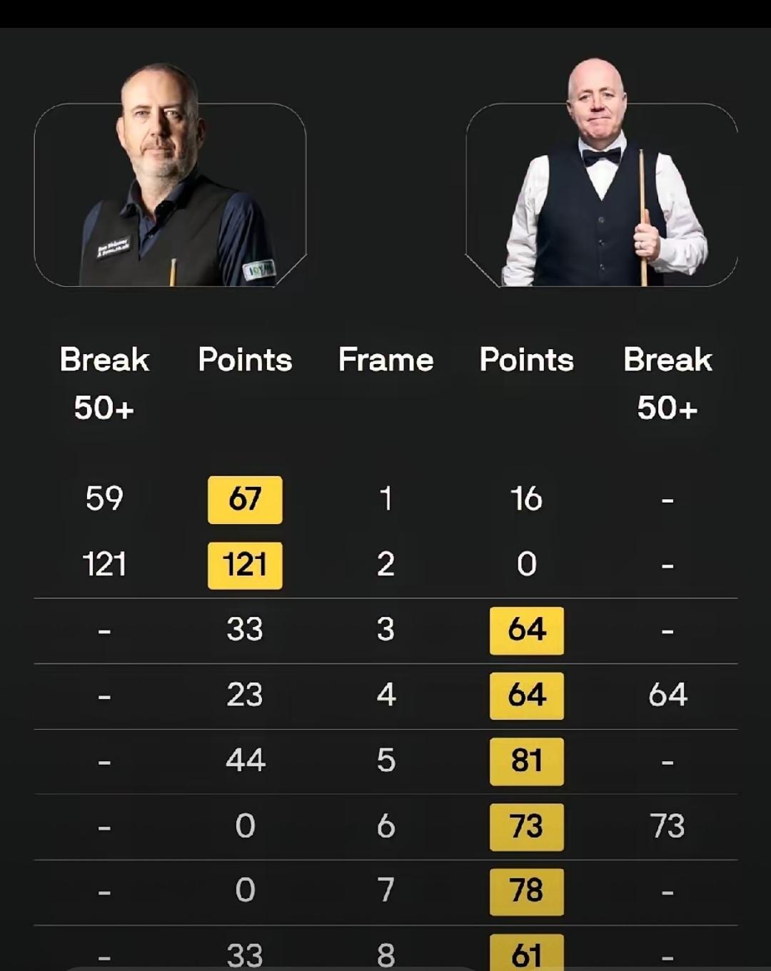 巡回锦标赛八强争夺战!希金斯六连鞭!第一阶段6-2领先马克威廉姆斯 在刚刚结束2026年斯诺克巡回锦标赛的八强争夺战中,两位七五三杰和马克威廉姆斯迎战约翰希金斯。比赛开始马克威廉姆斯打出一杆50+,轰出一杆破百。此后希金斯爆发。打出3杆50+,一波六连鞭反超局分6-2领先,结束第一阶段的比赛,比赛过程如下! 第一局,马克威廉姆斯凭借单杆59分,67:16先拔头筹。 第二局,马克威廉姆斯轰出单杆121分破百,零封希金斯,局分2-0领先。 第三局,希金斯状态有所提升,凭借零敲碎打得分,64:33扳回一局。 第四局,希金斯打出单杆64分,64:23再下一局,双方战成2-2平,进入中间休息。 第五局,希金斯延续良好的状态,凭借零敲碎打得分,81:44获胜,连赢三局反超局分3-2领先。 第六局,希金斯打出单杆73分零封马克威廉姆斯,一波四连鞭反超局分4-2领先。 第七局,希金斯凭借零敲碎打得分,78:0再下一局。 第八局,希金斯凭借成功的防守,多次上手零碎得分61:33拿下此局。最终,希金斯打出一波六连鞭,反超局分6-2领先。晋级八强近在咫尺。斯诺克世锦赛碗 斯诺克球员赛 斯诺克排名积分