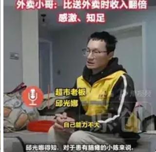 一次愧疚的寻人,改写19岁脑瘫少年的人生,这才是人间最暖的光 2025年,江苏宿迁超市一老板,由于一时疏忽让一外卖员在店内白白等了很久,她感到十分愧疚,果断发布寻人启事,寻找这位残疾外卖小哥,哪料见面后才发现,这位19岁小伙因脑瘫求职屡屡碰壁,月收入曾低至两三百元,没想到邱光娜的一个决定,不仅让他重获工作,还意外点燃了更多希望。 那天的疏忽,不过是邱光娜忙碌中无心之失,可看着监控里残疾小哥踟蹰等待、不敢催促的身影,她心里的愧疚久久散不去。换做旁人,或许一句抱歉便作罢,可她偏要较真,拍视频、发寻人,只想当面说句对不起,给这个辛苦奔波的人一点补偿。 当找到19岁的小陈时,所有人都破防了。因为脑瘫,他肢体不协调,说话也不利索,找工作时处处被拒,没人愿意给这个看似“不便”的少年一个机会。为了活下去,他咬牙跑外卖,风吹日晒不说,抢单慢、送餐易超时,扣完罚款后,月收入少得可怜,最艰难时只有两三百块,连基本温饱都难维持。可他从未放弃,哪怕步履蹒跚,也坚持靠自己的双手讨生活,这份倔强,看得人鼻酸。 邱光娜当场做了决定:直接聘他到超市工作,不用风吹雨淋,做些力所能及的活,薪资体面又稳定。她不仅给了少年一份生计,更懂“授人以鱼不如授人以渔”,还打算教他电商直播,让他拥有安身立命的本事。 这件事火遍全网后,无数网友破防留言。我们见过太多冷漠的拒绝,见过太多对弱者的漠视,才更懂这份善意有多珍贵。邱光娜的善良,从来不是居高临下的施舍,而是平等的体谅与尊重;小陈的坚强,也让我们看到,身处泥潭的人,依然有向阳而生的勇气。 这世间最动人的温暖,不过是陌生人的惺惺相惜,是一个人愿意拉另一个人一把。你心怀愧疚不忘弥补,我身有残疾依旧自强,双向的美好,才让这个世界满是光亮。脑瘫小男孩