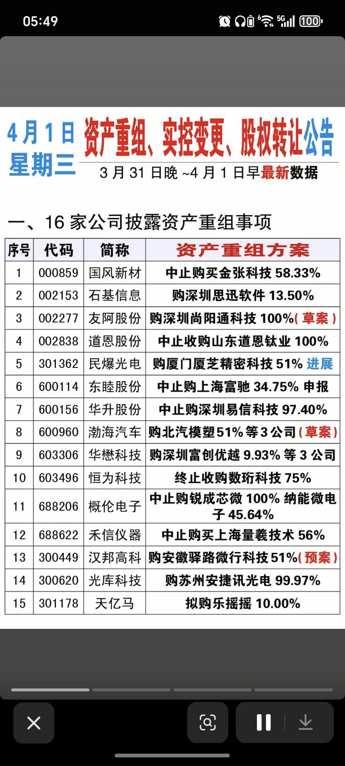 4.1周三 最新:上市公司公告精选汇总 主要涉及:资产重组、股权转让、减持计划、增持计划、实控人变更、回购公告、收购资产、出售股权等