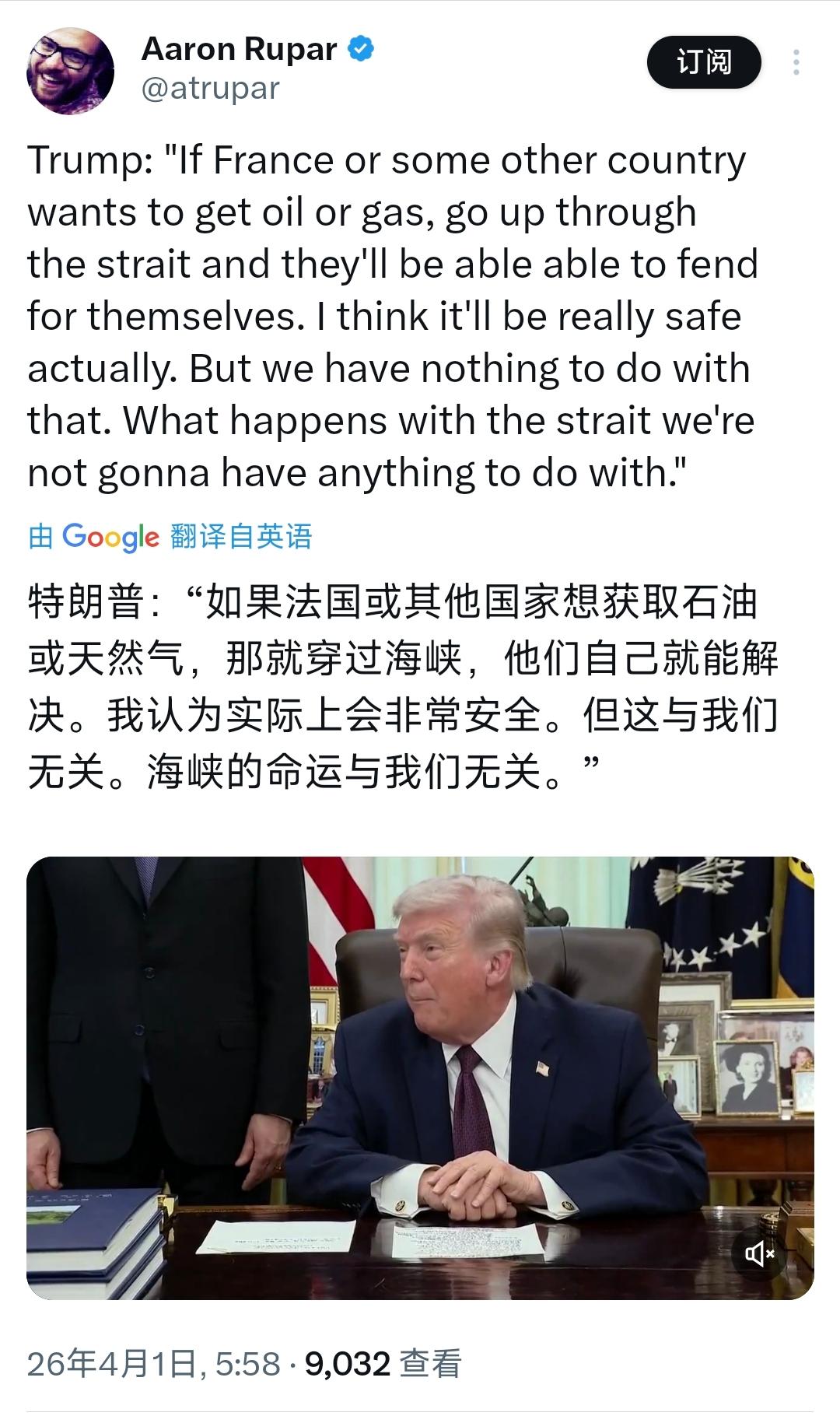 特朗普今天(北京时间4月1日)接受采访时表示:“如果法国或其他国家想获取石油或天然气,那就穿过海峡,他们自己就能解决。我认为实际上会非常安全。但这与我们无关。海峡的命运与我们无关。” [机智]评几句:特朗普搞事,但不打算自己负责到底。他一边伙同以色列挑起中东冲突,让霍尔木兹海峡航运陷入危机,一边甩锅称海峡命运与美无关,让法国等国自寻出路,这种言论尽显美式霸权的虚伪与懦弱。此前还扬言要对伊朗施猛烈打击、控制海峡,如今却因军事行动陷入被动,便想抽身事外,把盟友推到台前承受风险。要知道全球能源市场休戚与共,海峡封锁推高的油价早已反噬欧美,美国何来独善其身的可能?这种始乱终弃的做派,不过是为掩盖其战略失策的甩锅戏码,更是对盟友的极致背叛。