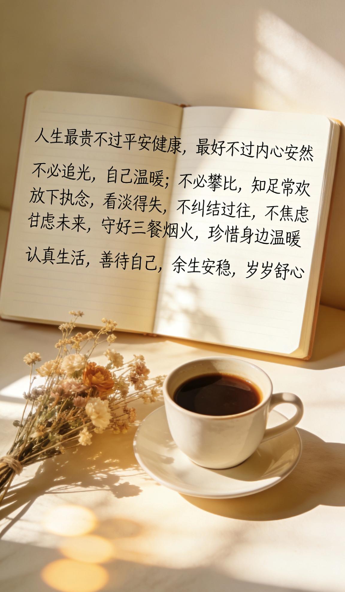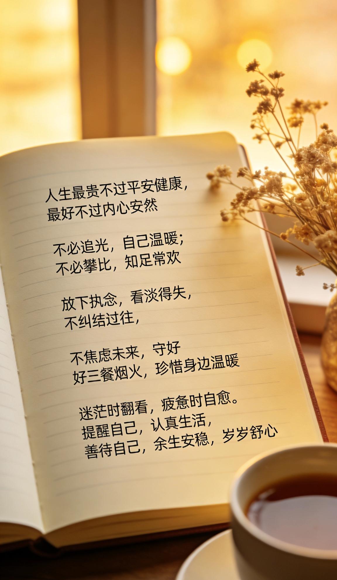 看到治愈的文字,总忍不住悄悄收藏。不是多华丽的辞藻,却句句戳心,字字温柔。 慢慢读懂,人生最贵不过平安健康,最好不过内心安然。不必追光,自己温暖;不必攀比,知足常欢。放下执念,看淡得失,不纠结过往,不焦虑未来,守好三餐烟火,珍惜身边温暖。 把这些通透感悟收藏心底,迷茫时翻看,疲惫时自愈。提醒自己,认真生活,善待自己,余生安稳,岁岁舒心。 生活感悟 暖心治愈 值得收藏