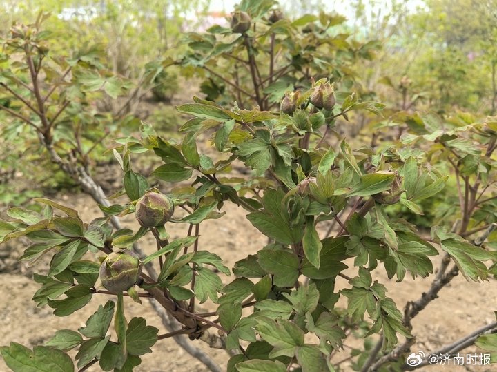 “并蒂牡丹本就罕见,单株长出3枝、6枝并蒂花,更是菏泽牡丹栽培史上难得一见的奇事。”国家林草乡土专家、菏泽牡丹园总经理王志伟指着枝头的花苞介绍,“墨润绝伦”作为牡丹中的黑色系珍品,花瓣如墨玉般沉稳,花蕊似金箔般娇艳,本身就极具观赏价值,此番“3+6”并蒂共生,更添几分天赐祥瑞之气。据测算,这些并蒂花苞预计在4月13日左右陆续绽放。
