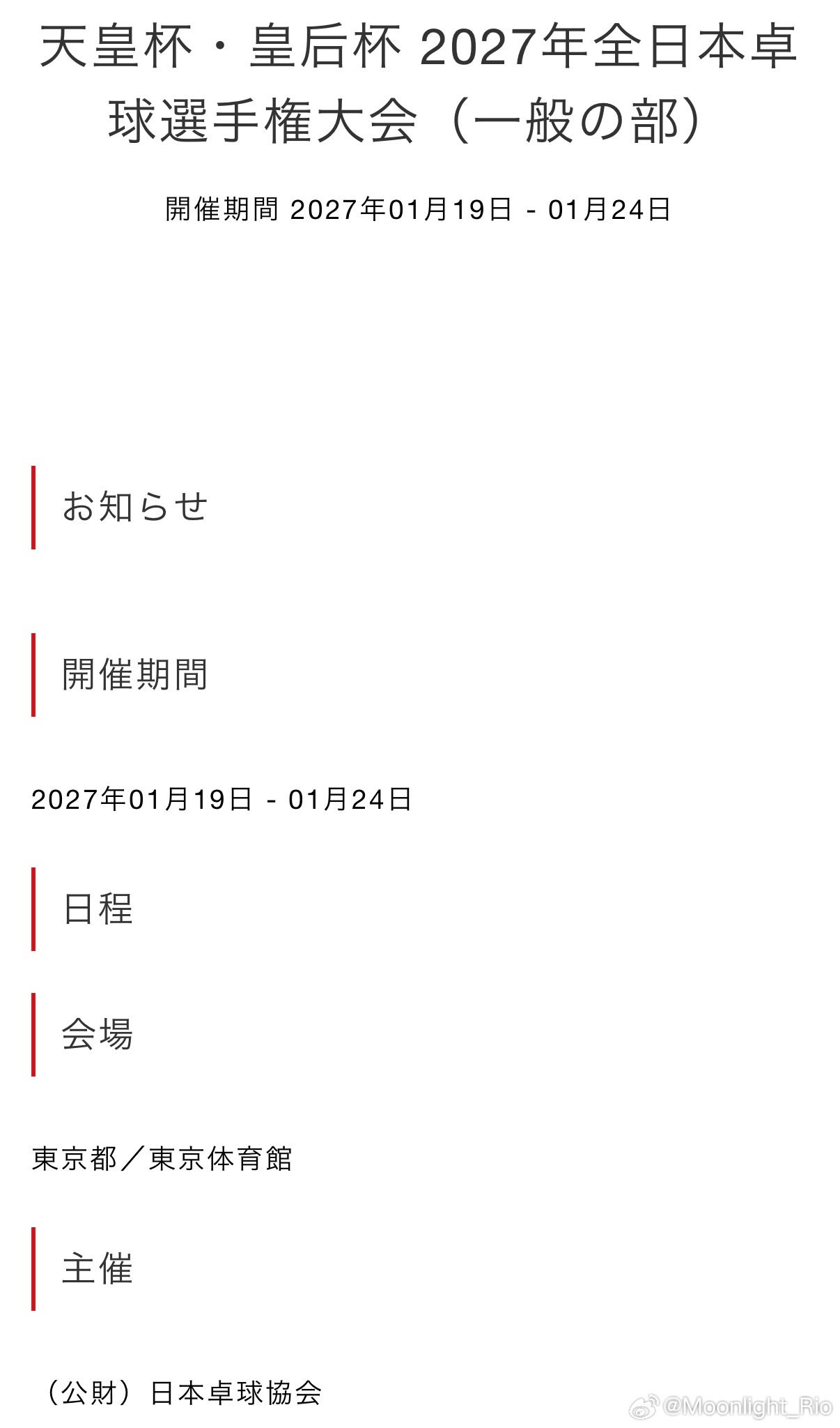 2027年全日本乒乓球锦标赛(成年组)举办时间:1月19日-1月24日