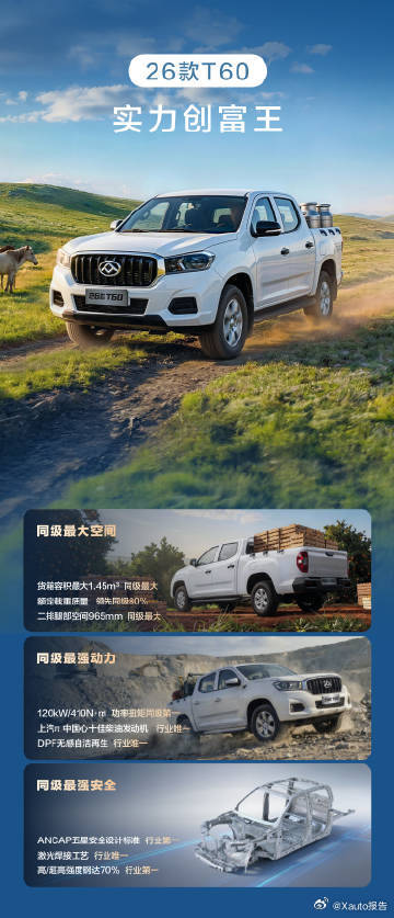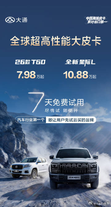 大通全新星际L上市买车先试开爽7天再下单大通全新星际L皮卡上市,10.88万起,26款T60售7.98万起。星际L动力强劲、载重翻倍、底盘扎实,标配丰富。品牌高端皮卡出口第一,累计下线40万辆,还推出行业首创7天免费试用。