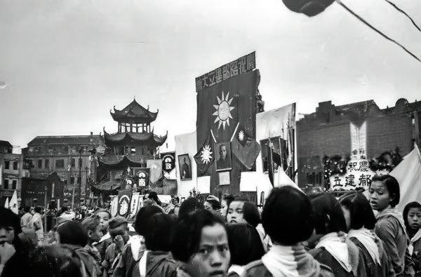 1937年,国民政府迁都重庆,正式宣布重庆为“陪都”,临江门魁星阁广场上矗立着巨大的旗帜和画像,中心是孙中山先生的遗像,左右簇拥着青天白日旗,横幅上写着“庆祝陪都建立”。密密麻麻的民众,尤其是许多朝气蓬勃、青年学生,挤在人群里,或许还不知道未来的路有多艰辛,但那一刻的肃穆已刻入骨血。