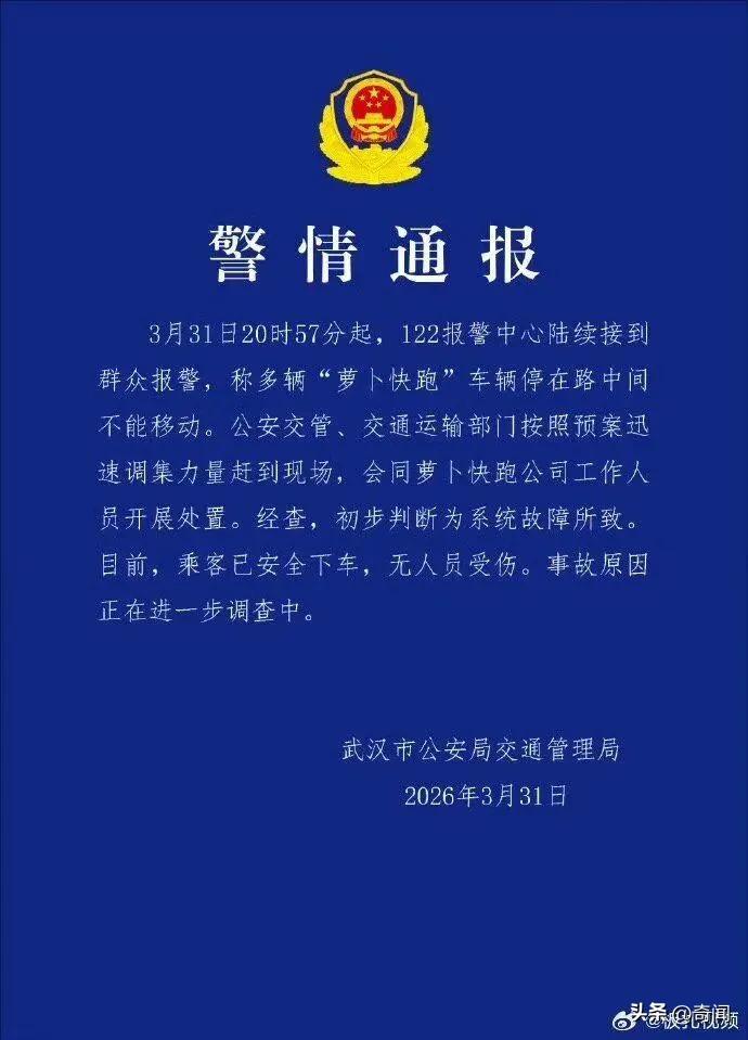 武汉近100辆萝卜快跑出租车集体故障,在武汉二环线和三环线以及白沙洲大桥等主干道无法行驶导致交通大面积拥堵,乘客被困车内!事发3月31日大约21点开始,武汉市内许多萝卜快跑出租车宕机停摆马路中央。 122交通警务接到大量的报警,随后警方好和交通运输部门赶到各地事故现场,确认乘客安全下车后,将所有车辆拖离,疏通道路,同时联合萝卜快跑公司排查故障,经过初步确认,为萝卜快跑系统故障,武汉所有车辆全部被停止运营。 警方通报,本次故障没有人员伤亡。但是有部门因此事发生追尾,正常走保险流程。有网友称车门可以开,但是高架路不敢出去,被困车内在高架上2小时,大货车呼啸而过,吓死了!有关专家表示:可能是萝卜快跑核心系统宕机导致武汉全部车辆停运,恢复运营时间还没有公布,至少得查清问题公布并通报给相关管理单位后才能运营。 有关社会学专家表示,随着智能AI化越来越流行,各类系统逐渐演变为了无人管理化和单一集中化,这样确实节约了成本,但是一旦出现故障问题,那就会影响全部所有的设备,特别是被别有用心的人可以破坏和战争时期,集中化系统将比分布式系统更容易引起麻烦。 武汉近100将萝卜快跑出租车故障 武汉所有萝卜快跑出租车被停止运营 萝卜快跑大面积故障无法行驶乘客被困