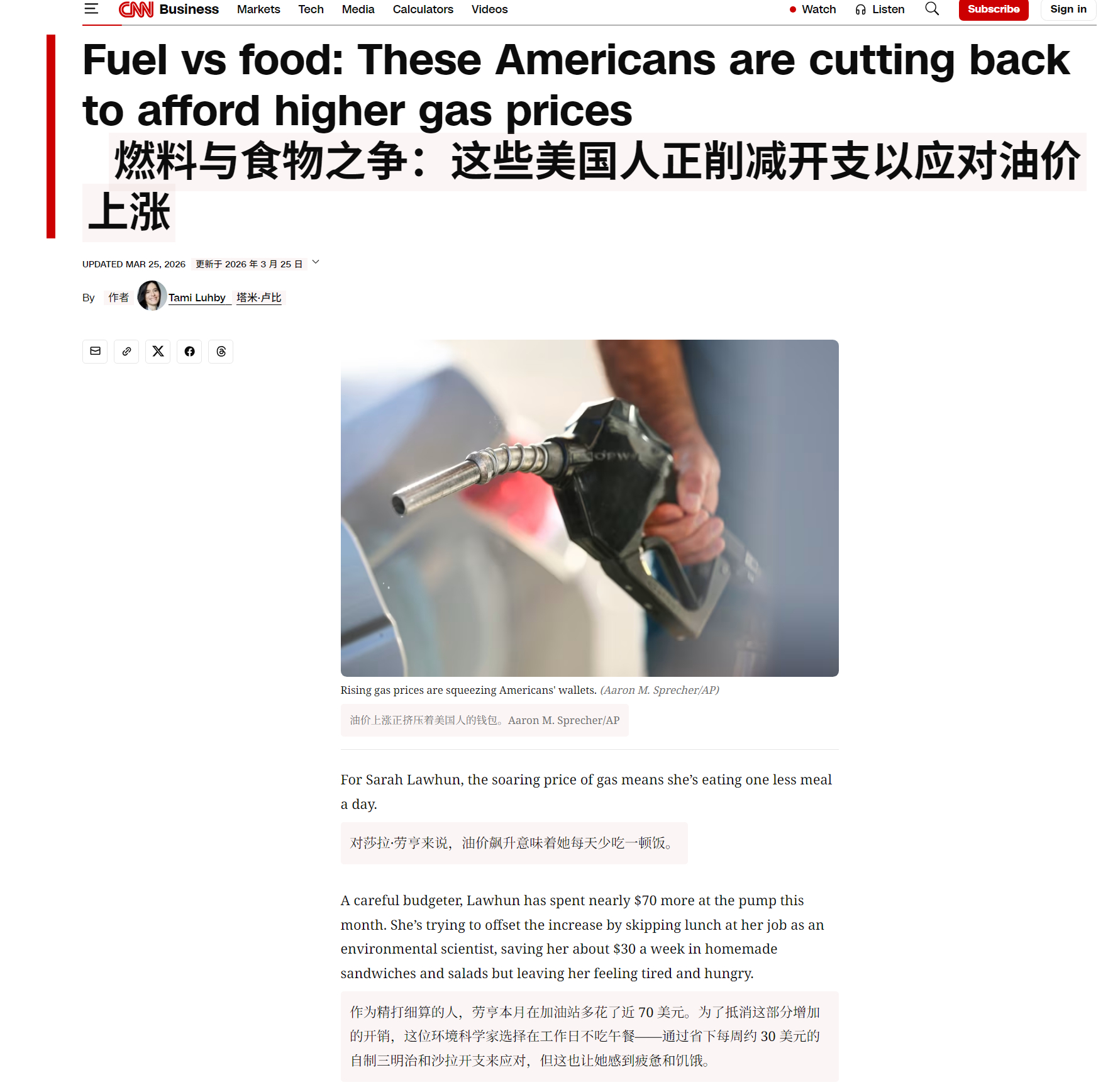 🔻CNN:美国人在加油和吃饭之中二选一。🔻沟槽的斩杀线跑着追杀美国人,这是 CNN 的报道。🔹对莎拉·劳亨来说,油价飙升意味着她每天少吃一顿饭。🔹作为精打细算的人,劳亨本月在加油站多花了近 70 美元。为了抵消这部分增加的开销,这位环境科学家选择在工作日不吃午餐——通过省下每周约 30 美元的自制三明治和沙拉开支来应对,但这也让她感到疲惫和饥饿。🔹令她倍感压力的是,她担心即使美以与伊朗的战争结束,油价仍将居高不下,并导致食品价格上涨。她已经开始减少购买新鲜蔬菜和肉类,更多地光顾折扣杂货店,试图维持储蓄能力和偿还医疗债务的能力。🔹“除了其他所有开销,我们谁都不需要油价上涨,”31 岁的劳亨说道,她住在纽约州奥尔巴尼郊区,每天上下班通勤往返 50 英里。“想要有所结余真的非常非常困难。”🔹劳亨是数百名致信 CNN、讲述油价上涨对家庭财务影响的美国人之一。许多人表示,他们被迫削减必需品开支,以及旅行、娱乐和其他有助于推动经济的消费。🔹这种痛苦并不仅限于那些已经难以维持生计的人。那些自认为是中产阶级、并声称拥有好工作的人士也向 CNN 表示,他们不得不勒紧裤腰带,尤其是在经历了多年食品、公用事业(水电气)、住房和其他必需品价格高昂的困境之后。🔹根据美国汽车协会的数据,上周三全美范围内一加仑汽油的平均价格为 3.98 美元。这比过去一个月上涨了 1.01 美元,涨幅达 34%。🔹劳亨的担忧不无道理。油价比较网站 GasBuddy 的石油分析主管帕特里克·德哈恩表示,一旦冲突结束,汽油价格每天可能只会下降 1 到 3 美分。与此同时,专家表示,更高的价格将渗透到其他需要运输的产品中,包括食品。🔹对一些人来说,尤其是送货司机和那些在工作中花大量时间在路上的人来说,汽油价格的飙升意味着他们赚的钱更少了。🔹为沃尔玛送货的独立承包商马克·埃尔南德斯收集了他的收据,并记录了他加油的山姆会员店油价的稳步上涨:2 月 24 日每加仑 2.45 美元;3 月 3 日 3.08 美元;3 月 10 日 3.35 美元;3 月 17 日 3.69 美元;3 月 20 日 3.83 美元。🔹与此同时,这位德克萨斯州埃尔帕索市的居民自战争开始以来,订单和小费也减少了,每周收入因此减少了几百美元。这种双重打击促使他申请其他工作,包括救生员,以补充收入。他还在网上寻找不需要开车的工作。他理想的工作是居家办公。与此同时,他每周都要给他的 2008 款道奇战马加好几次油,试图在油价上涨前做好准备。🔹“我知道油价每天都在上涨,”42 岁的埃尔南德斯说,他每天早上都会在网上查看油价。最让他感到恐惧的是不知道每天在加油站要花多少钱。🔹油价飙升也打乱了家庭日程,父母们不得不减少与孩子们的活动,以限制开车出行。🔹现在,德克西亚·比林斯利每周加油至少要多花 15 美元,这意味着她只能已停止所有非必要驾驶以节省开支、开起亚 Telluride 送孩子上学和去当保安的工作。她不得不停止带 3 岁的儿子去公园,他喜欢那里的秋千。这种变化导致她患有自闭症的儿子行为更加失控。🔹“我只去必须去的地方,别无他处可去,”现年 35 岁、居住在佛罗里达州杰克逊维尔的比林斯利说道。🔹比林斯利也无法开车送她 12 岁的女儿去参加活动,也无法在本月初的春假期间带家人进行短途公路旅行。让她感到难过的是,她让他们失望了。🔹“我已经尽力了,”她说,“我不想让孩子们失望,告诉他们我做不到。”然而,有些家庭责任无法推迟。🔹帕特里克·德斯蒂文斯和妻子下周将驱车 2800 英里返回位于华盛顿州温哥华市的家中。此前,他们一直在照顾德斯蒂文斯身患绝症的母亲——这位住在宾夕法尼亚州约克市的老人已于 3 月中旬去世。由于预计燃油费将增加 100 美元,他们为此次旅途的食宿制定了严格的预算。🔹就在德斯蒂文斯从土木工程岗位请了数周无薪家庭假来照顾母亲之际,油价暴涨的冲击接踵而至。此外,他和兄弟姐妹们现在还必须承担母亲的丧葬费用,而这笔开支原本并未列入他的预算。🔹一旦他回到家,就不得不面对当地好市多加油站上涨的油价。他一直在查看商店的应用,发现现在的油价是每加仑 4.79 美元,比他二月底离开时高出了一美元多——他预计这将削减他的储蓄能力,并增加他的信用卡债务。🔹“这是我始料未及需要担心的事情,”33 岁的德史蒂文斯谈到油价上涨时说,“这非常令人沮丧,我讨厌这样。”🔹迈克·申塔格未曾预料到自己会需要关心汽油价格。他和妻子朱莉娅·伦肯驾驶的都是电动汽车。🔹然而,中东冲突爆发后不久,他不得不将自己的 2025 年款 Rivian SUV 送进维修厂更换悬挂系统,这花费了近两周时间。当他得知租车公司只提供燃油车时,他的第一个念头是:“天哪,这真是最糟糕的时机。”🔹身为工程师的申塔格试图更多地在家工作,并使用妻子的电动车处理杂事,以减少对租来的马自达 3 的使用。尽管如此,他上周还是不得不给这辆车加了价值 52 美元的汽油,并在周三归还前又加了 53 美元。🔹相比之下,他在科罗拉多州博尔德家中为他的 Rivian 充电每月只需花费 46 美元。🔹“一周的油费比我一个月的充电费还高,”35 岁的申塔格说道。🔻感受一下什么叫做“美国巨额的痛苦消费”,这是美国人省不下的钱。伊朗打击美军指挥中心特朗普称两到三周结束战事海外新鲜事中东现场