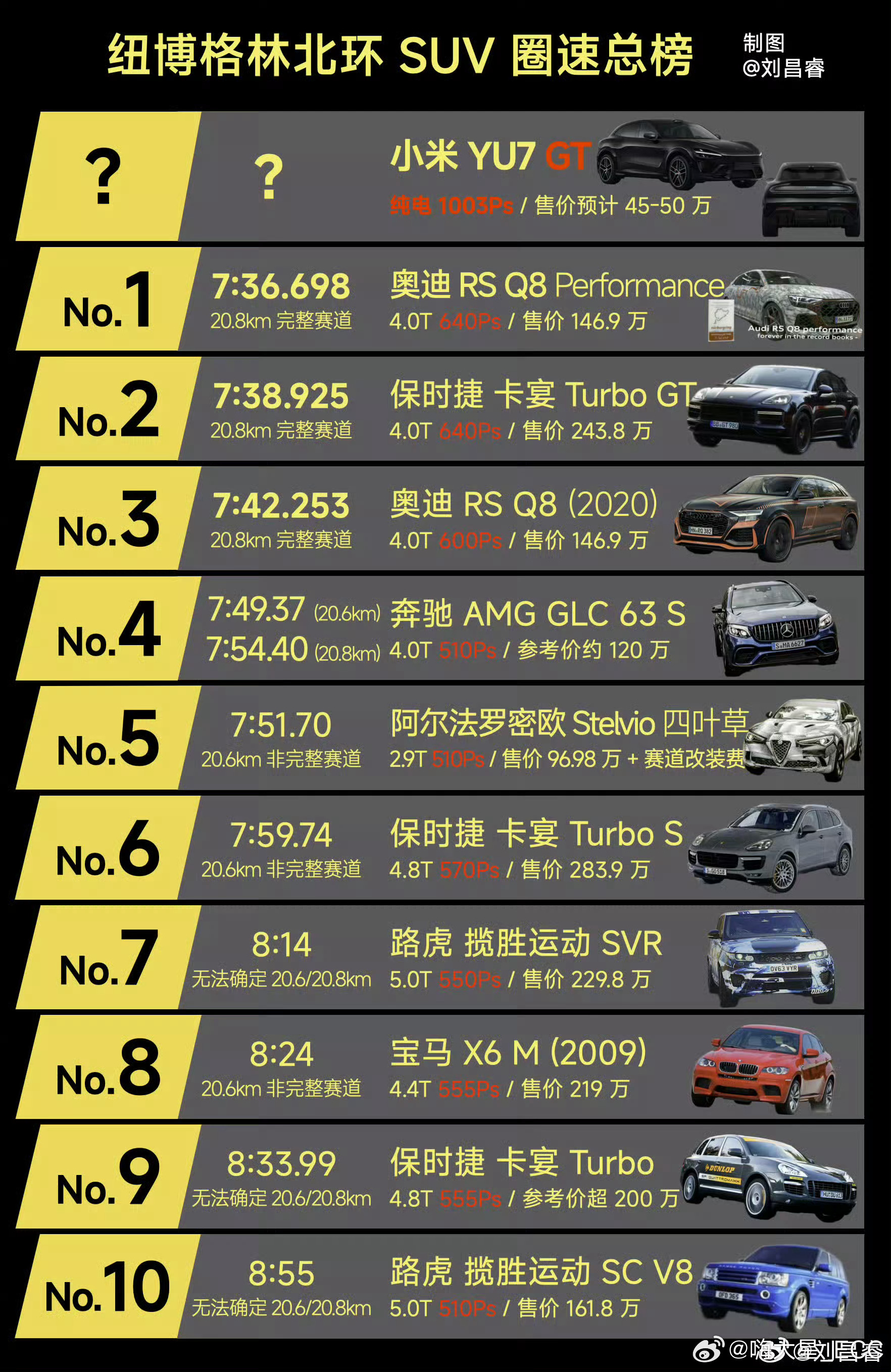 YU7GT已经拉去纽北跑圈速了目前纽北量产SUV最速圈速是 7:36.7,由 奥迪RS Q8 Performance 在2026年3月创造。YU7GT能否打破,北京车展就知道了小米YU7GT新配色现身纽北
