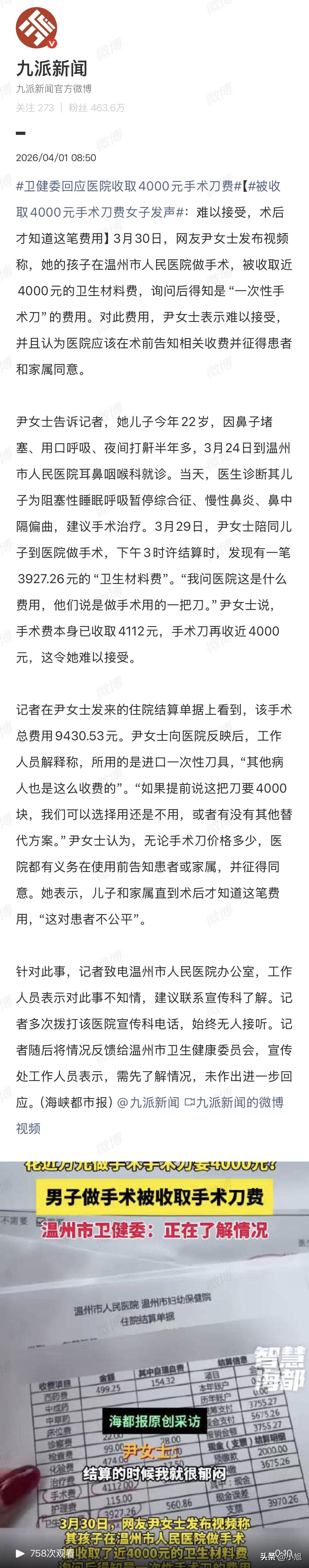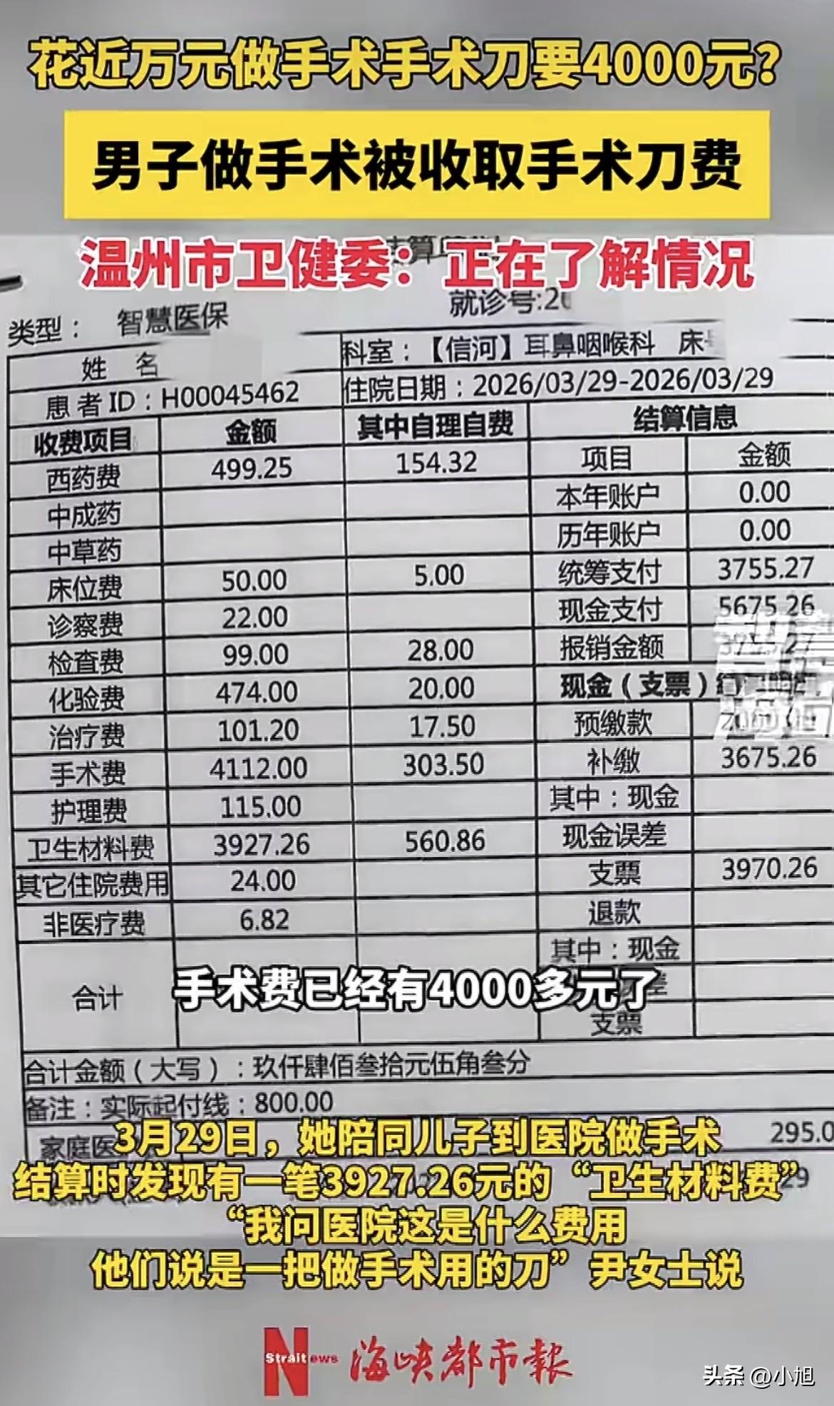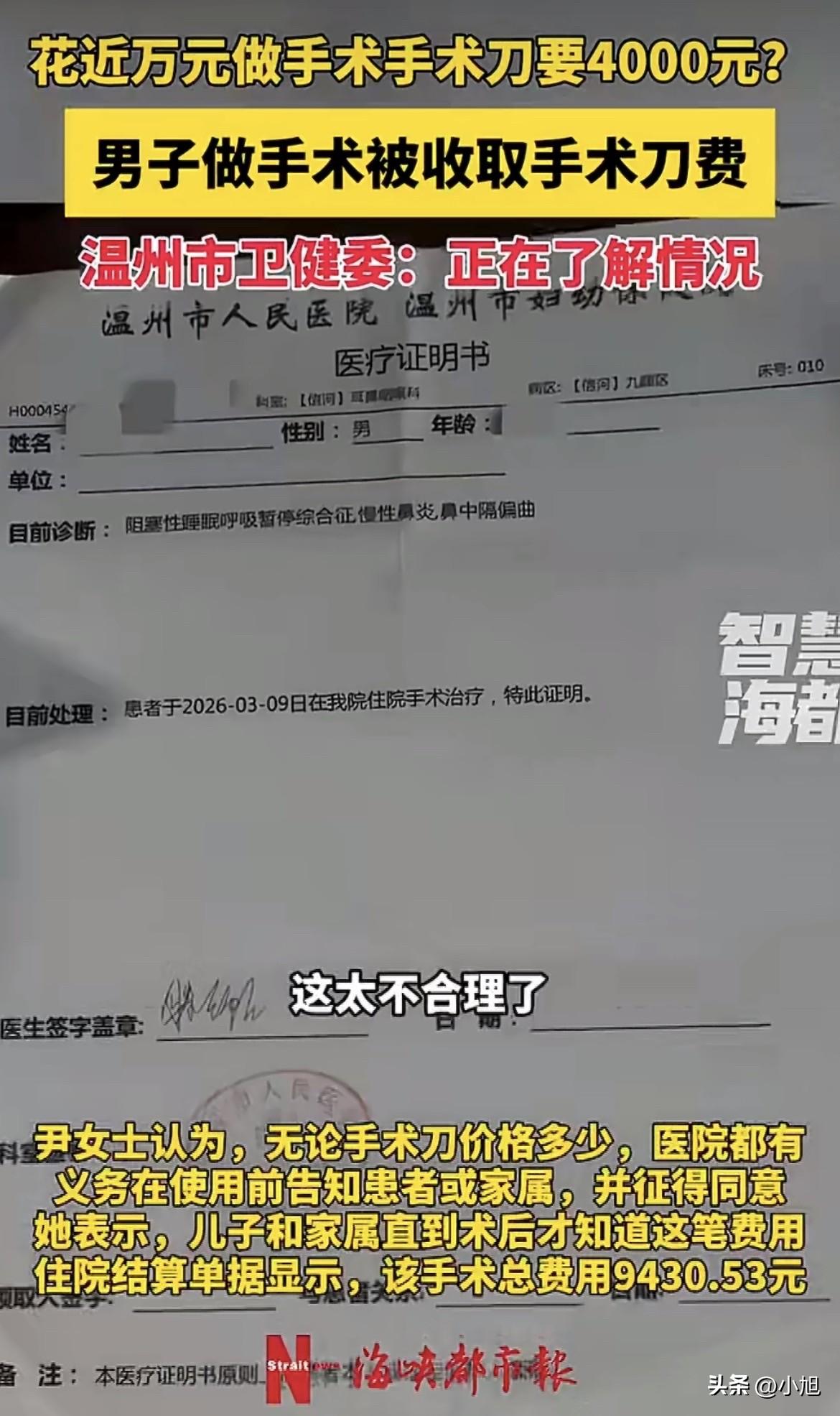 22岁的大小伙子,做鼻子手术。虽然不是开胸开腹的大手术,但全麻的,当妈的一颗心一直悬着。 好不容易等到手术结束,医生说一切顺利,她这口气总算松下来了。 结果去缴费窗口办结算,一看单子,整个人愣住了。 总费用9430.53元。她认了,给孩子看病,多少钱都得花。但账单上一项叫“卫生材料费”的数字,让她反复看了好几遍——3927.26元。 她问收费的人,这是啥费用? 人家告诉她,是做手术用的一把刀的钱。 一把刀,将近四千块。 她赶紧翻了一下账单,手术费那一栏是4112元。也就是说,那把刀的价格,跟整台手术的劳务费几乎一样。 当妈的心里一下子就堵上了。 手术费是医生技术的钱,她认,该给。可这把刀凭啥也这么贵?它到底是个什么东西? 她找到医院的工作人员问,得到的解释是:用的是进口一次性刀具。 还补了一句话:“其他病人也是这么收费的。” 这句话听着好像没毛病,但她越想越不对劲。 问题根本不在那把刀值不值这个价——她不懂医疗器械的行情,没法判断。问题在于,从看病到手术做完,从头到尾,没有任何一个人跟她提过这笔钱。 孩子3月24号去看的诊,诊断是阻塞性睡眠呼吸暂停综合征、慢性鼻炎、鼻中隔偏曲。医生说建议手术,她说行,那就做。 3月29号住进医院做手术,下午三点多结算。整个过程,从门诊到住院到手术,没有一个人告诉她,这台手术要用一把将近四千块的刀。 她说了一句话,听着特别扎心:要是提前知道这把刀要四千块,我们可以选择用还是不用,或者问问有没有别的替代方案。 这才是最要命的地方。 这把刀,不管它是进口的还是国产的,不管它效果多好,价格多贵,用之前是不是应该跟家属说一声? 四千块钱,对有些家庭来说不算什么,但对普通老百姓来说,那是一笔不小的负担。更关键的是,这笔钱根本不在她的预期里。她以为手术费四千多块就够了,结果又多出来一把刀的价钱,总费用直接飙到九千多。 她事后才知道,是问出来的。 医院的人说“其他病人也是这么收费的”,这个解释听着好像挺有道理,但仔细一想,根本站不住脚。 其他病人愿意掏这个钱,不代表每个病人都愿意。再说,其他病人术前知不知道这笔钱,也是个问题。也许其他病人也没被告知,也许他们也没发现,也许他们发现了也觉得不对劲但没吭声。 “其他病人也是这么收的”——这句话把一个本该提前告知的事情,变成了一个“惯例”。好像只要别人也这么交了,这事儿就合理了。 可惯例不能代替知情同意。 按照《民法典》第一千二百一十九条的规定,需要实施手术的,医务人员应当及时向患者具体说明医疗风险、替代医疗方案等情况,并取得其明确同意。这里面就包括费用。尤其是几千块钱的自费项目,术前不说清楚,术后让家属买单,这跟先斩后奏有什么区别? 她向医院反映之后,到现在也没个说法。记者打电话到温州市人民医院办公室,工作人员说不知情,让联系宣传科。宣传科的电话打了好几次,始终没人接。 后来又找到温州市卫健委,宣传处的工作人员说,需要先了解情况,也没给个明确的回应。 这事说到底,不光是钱的事。 现在医疗纠纷这么多,很多时候不是因为医生没治好病,而是因为花钱的事没提前说清楚。病人进了医院,医生说什么就是什么,病人和家属基本没有选择权。尤其是手术当中用到的高价耗材,如果术前不告知,术后才让家属买单,那跟先斩后奏有什么区别? 医院当然可以说,进口刀效果好,恢复快,为了病人好才用的。这话也有道理,但好不好的前提是,家属得知道花了多少钱,得有机会选择用还是不用。 她儿子今年22岁,因鼻子堵塞、用口呼吸、夜间打鼾半年多才去看的医生。这个年纪的孩子,做手术肯定遭罪,当妈的心疼。手术做完了,孩子没事,这比什么都强。但看到账单上那把刀,心里那股火怎么都压不下去。 她说得特别实在:这对患者不公平。 确实不公平。花钱没问题,但得让我知道花在哪儿了,花之前得让我同意。 那把刀到底该不该收这个钱,医院得给个说法。但比这个更重要的是——下次再做手术,医院能不能在术前把话说清楚? “其他病人也是这么收的”——这句话,不该成为医院不告知的理由。 你觉得,医院这么做合适吗?换成是你,这把刀的钱你会认吗? 来源:海峡都市报(记者 梁展豪)、九派新闻