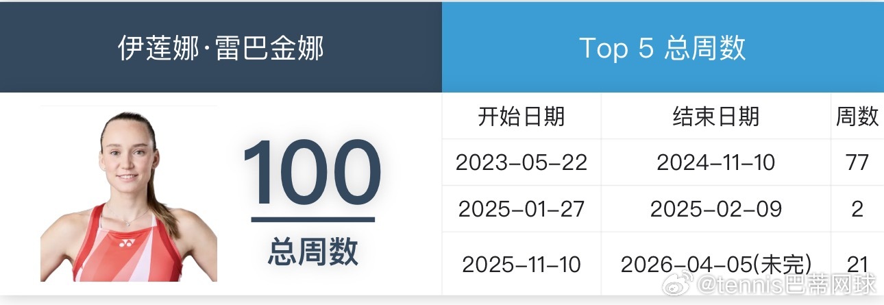 莱巴金娜在WTA位居top5总周数已达到100周。