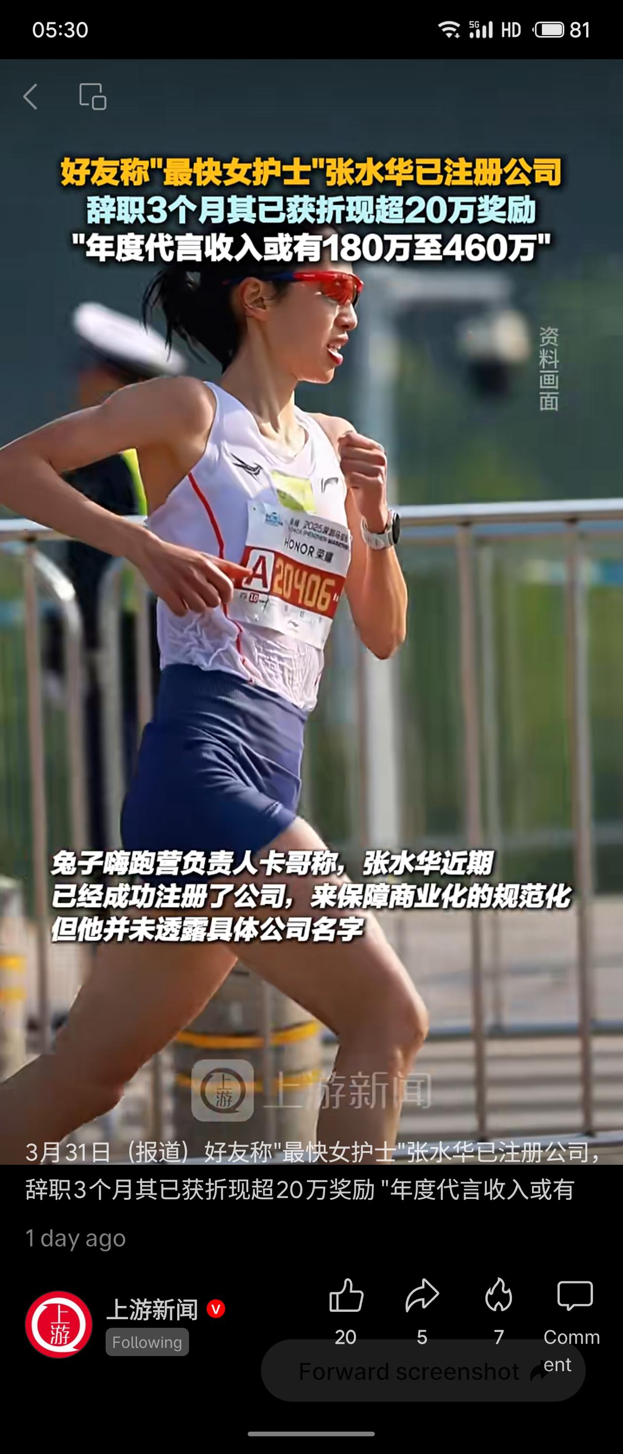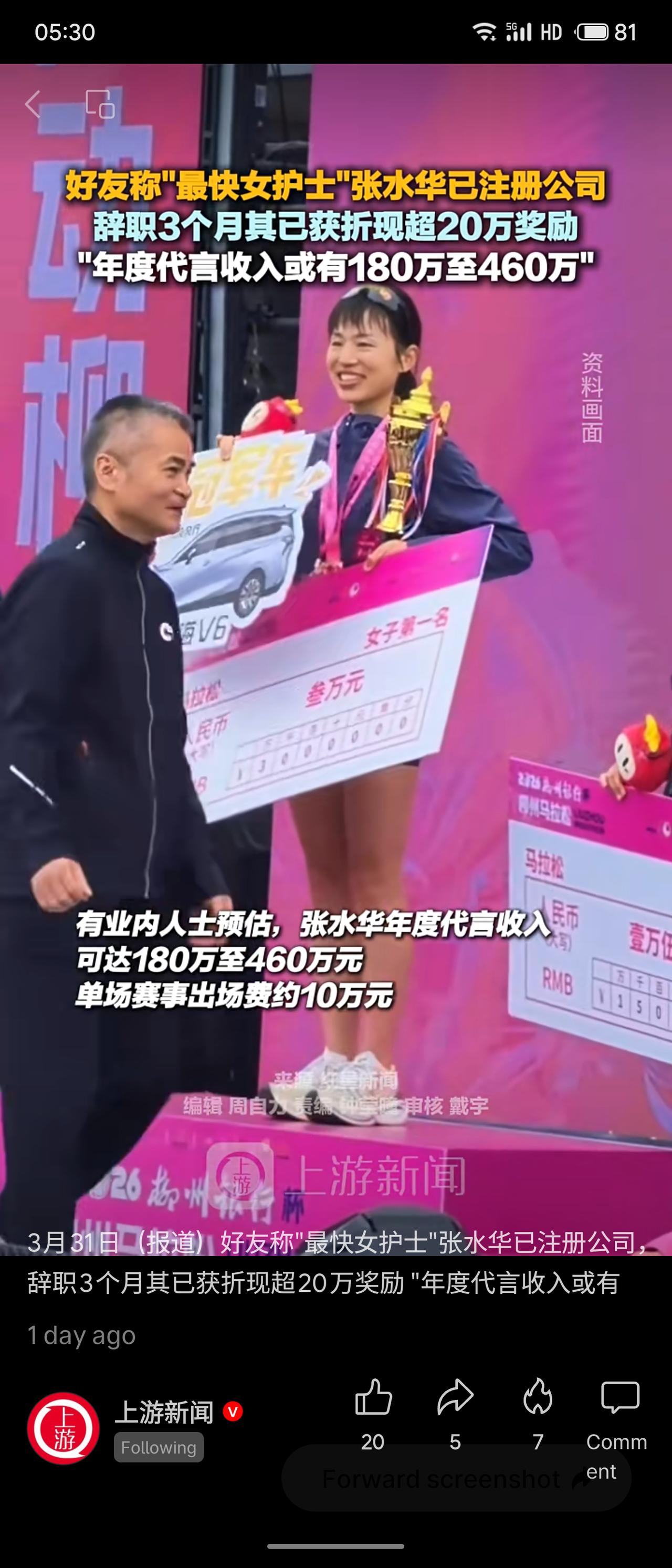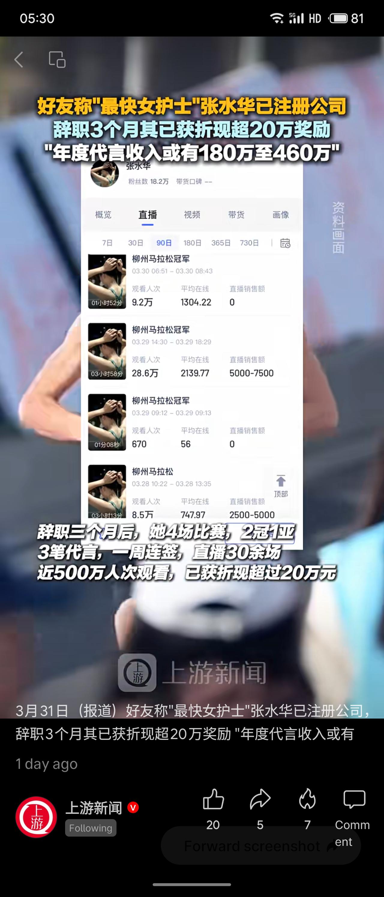 “最快女护士”张水华辞职3个月后,已注册公司推进商业化。好友称她获折现奖励超20万元,业内人士预估其年度代言收入可达180万至460万元,单场赛事出场费约10万元。期间她参赛获奖、签约代言、直播30余场,累计观看近500万人次。 从护士转型职业跑者,张水华凭借实力成功开拓商业价值,展现了个人品牌化发展的可能性。但在流量变现的同时,也需平衡公众期待与商业运作,保持竞技初心。