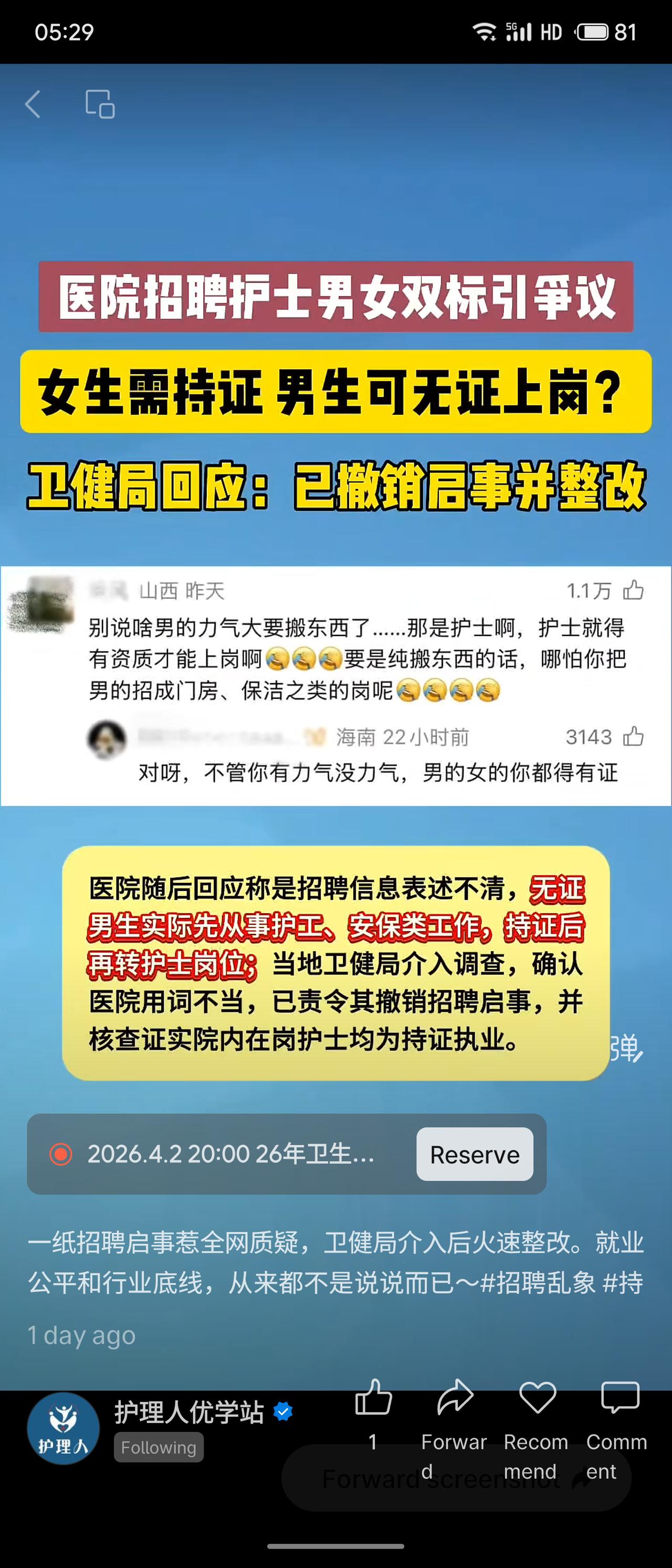 贵州铜仁德康医院招聘护士时,要求女生持证、男生可无证先上岗,引发性别歧视争议。卫健局介入后认定医院用词不当,已责令撤销启事并整改,核查确认在岗护士均持证执业。此事警示,医疗执业必须严守资质底线,就业公平不容打折。