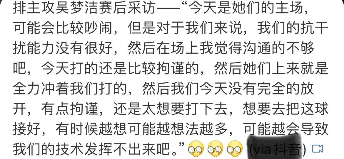 吴梦洁将失利原因归咎于上海主场太吵?0-3惨败给上海女排赛后,江苏女排核心吴梦洁接受了记者的采访。首先,她提到上海主场可能比较吵,随后,她也提及了失利的重点就是太想打下去,所以,想赢怕输的心态在强队对决中可能就是最致命的因素,江苏队如果不能把这心态调整过来,就称不上真正的强队,4月1日的决胜场也可能再次失利从而使得卫冕的愿望泡汤!