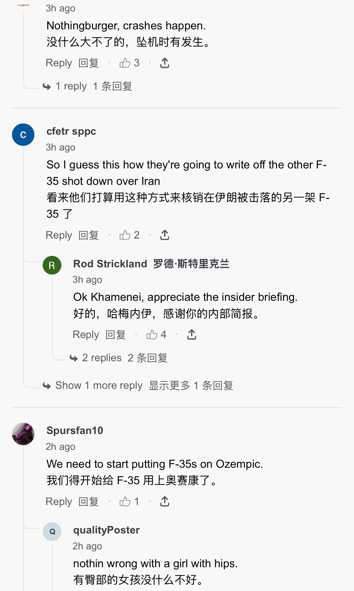 🔻TWZ评论区也认为美军今天摔的F-35“会不会是平账啊?”伊朗打击美军指挥中