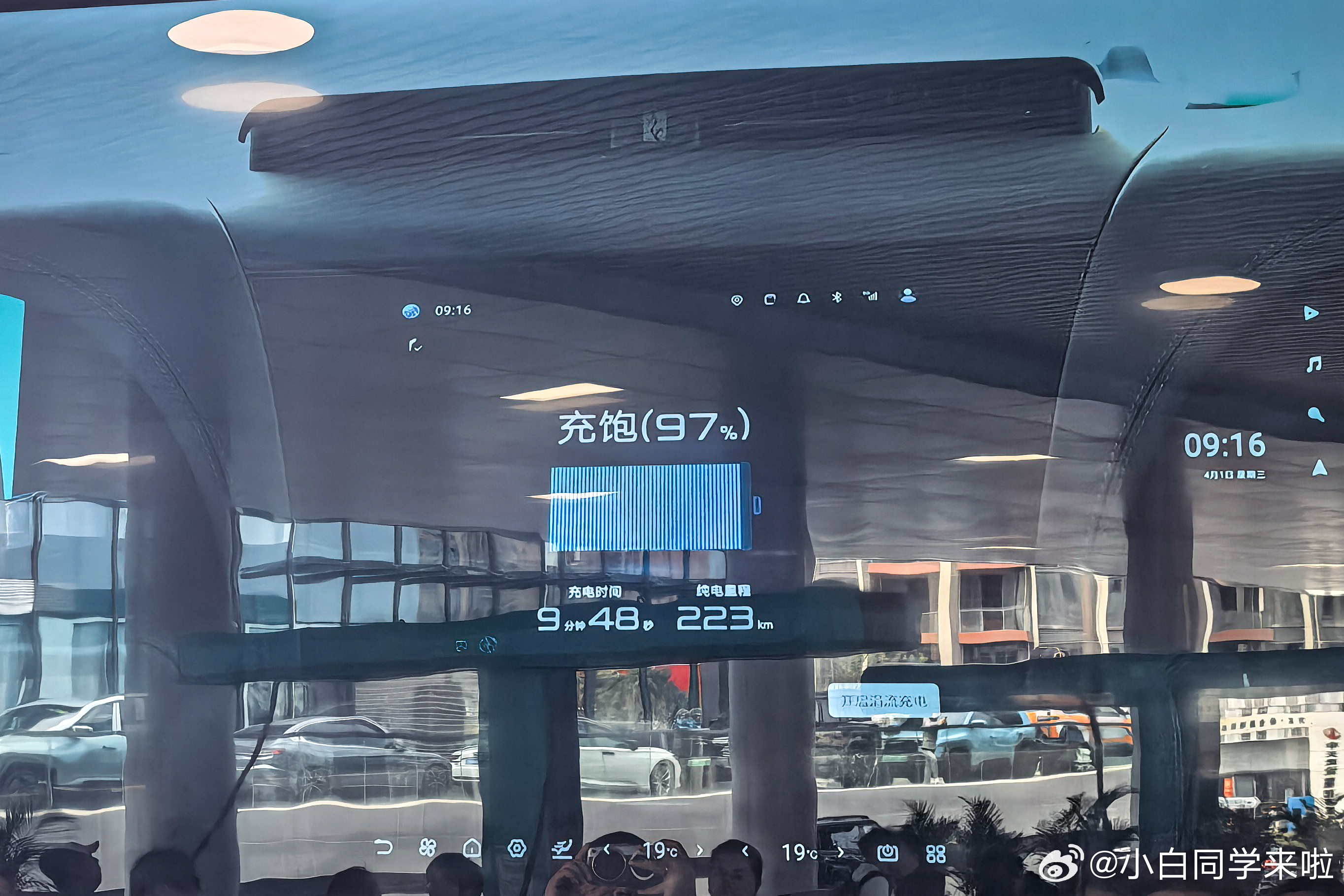 实测从 10%-97% 用时 9 分 48 秒,续航从 21km 充到 223km,相当于十分钟不到提升 202km 纯电续航。