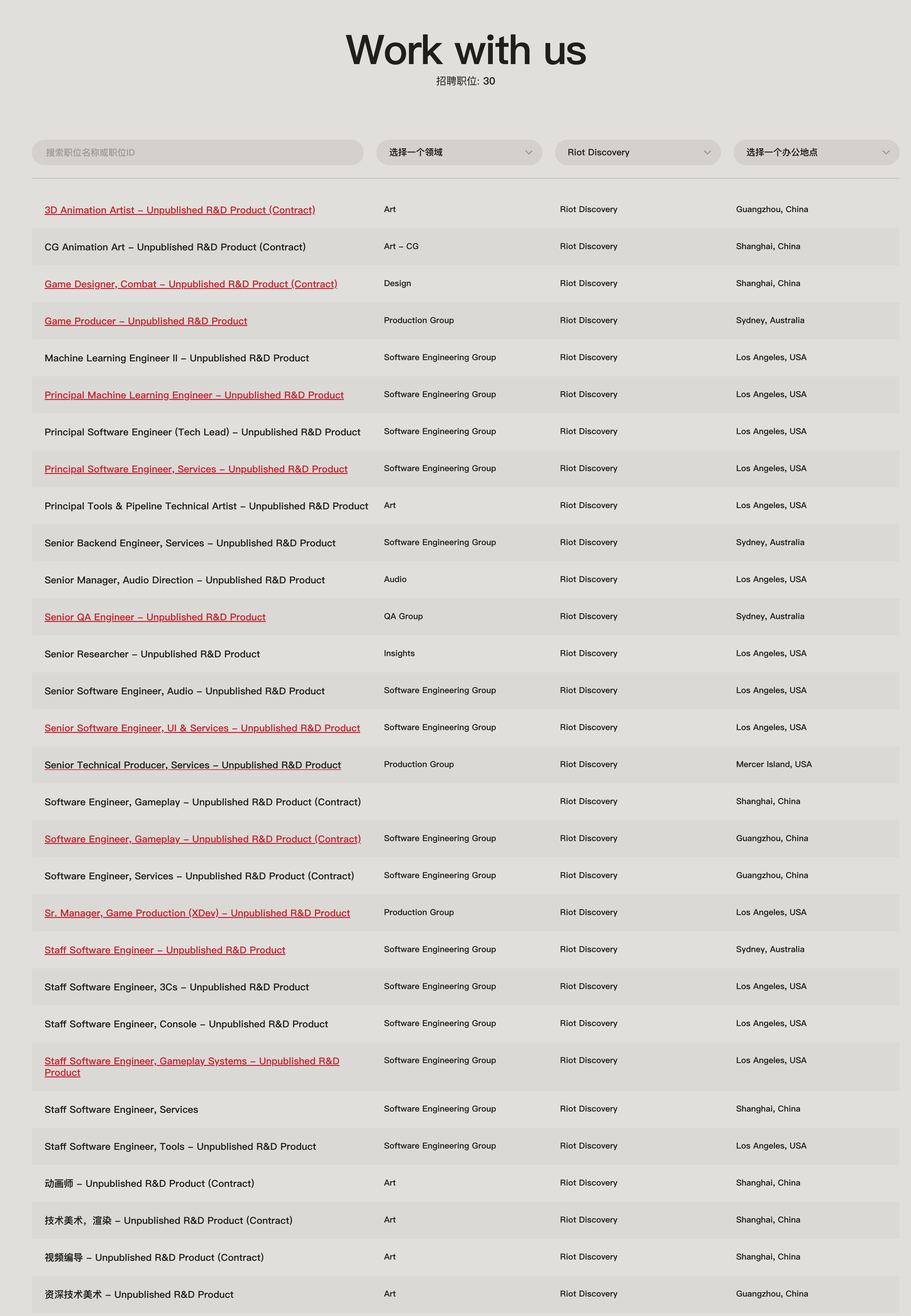 近日,拳头游戏发布Riot Discovery团队招聘信息。目前已在中国广州、上海,以及悉尼、洛杉矶等多地同步展开招聘,共计开放约30个核心研发岗位,招聘信息多次提及虚幻引擎,对PvE动作游戏/ARPG类型有深入理解与热情。