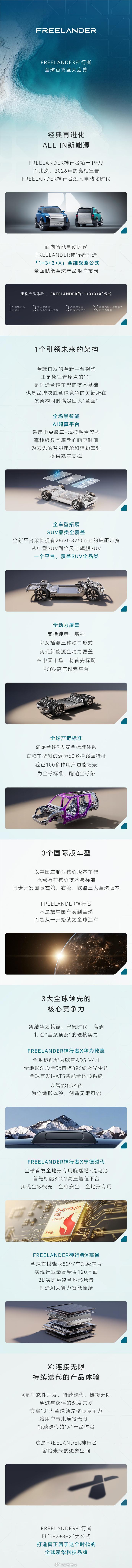 FREELANDER神行者 总结一下,核心就是1+3+3+X-1代表个引领未来的架构-第一个3代表3个国际版型覆盖全球市场-第二个3代表3大全球领先的核心竞争力-X代表连接无限、持续迭代的产品体验