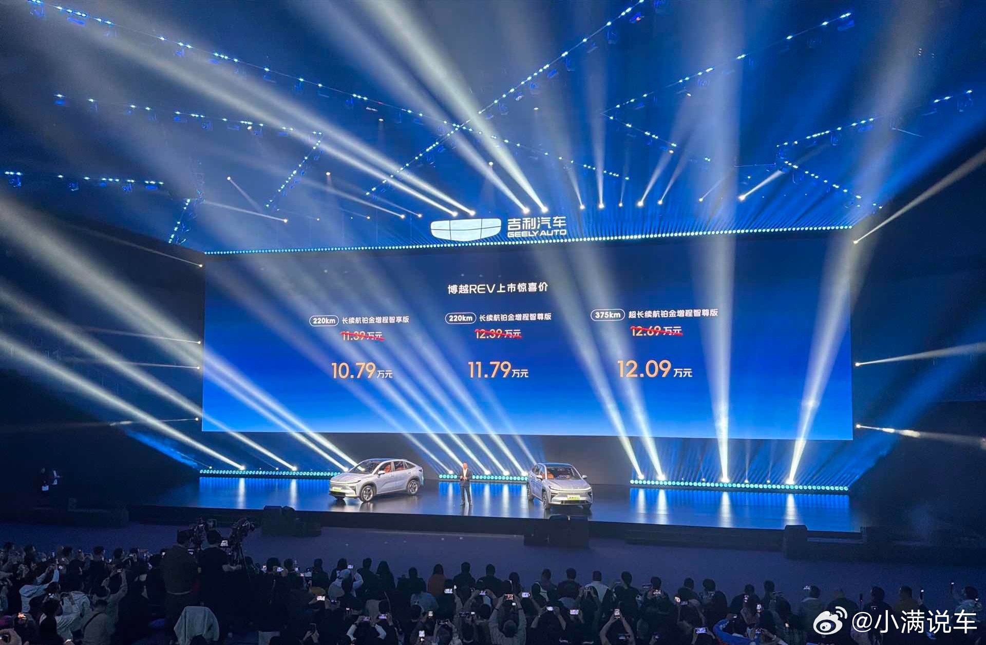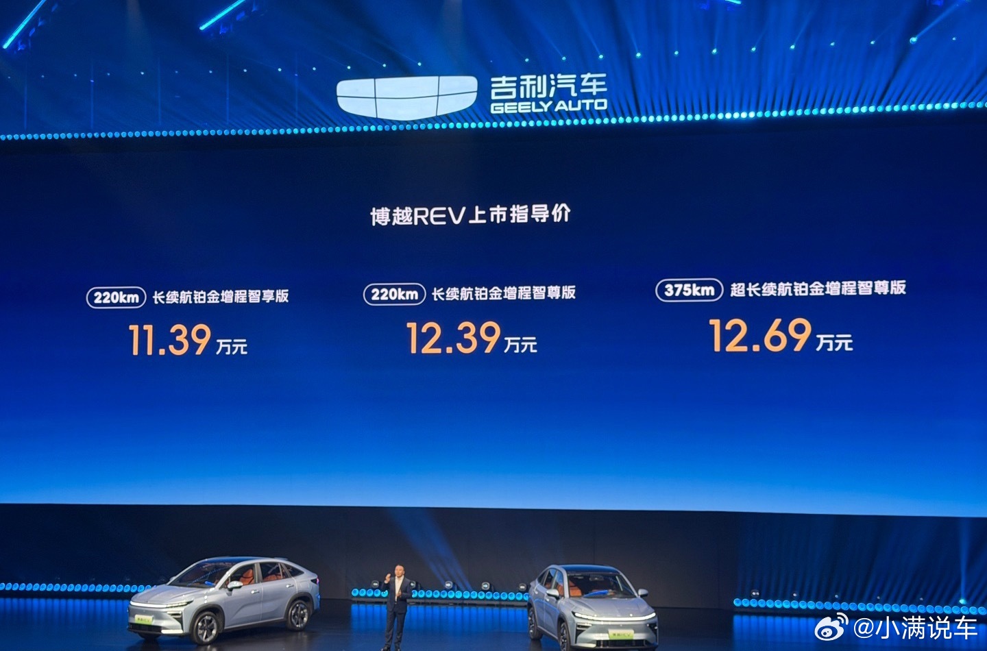 吉利博越 REV 搭载全栈自研 11 合 1 增程电驱,增程器采用阿特金森循环、EGR 废气再循环技术及“御风火龙卷”高效燃烧系统,热效率达到 47.26%,可实现 1 升油发电 3.77 度的能效水平,馈电状态下油耗为 4.95 升 / 百公里。新车搭载神盾金砖电池,CLTC 工况下纯电续航里程 375 公里。电池系统通过军工级安全认证,完成 36 项安全测试及射击、八针同刺等极限验证,支持 3C 快充技术,30% 至 80% 电量充电时间约 15 分钟,并具备 6 千瓦外放电功能。吉利博越 REV 号称是同级别续航最长、技术最好的增程 SUV,更是 12 万级唯一纯电续航 375km、综合续航 1525km 的增程 SUV。