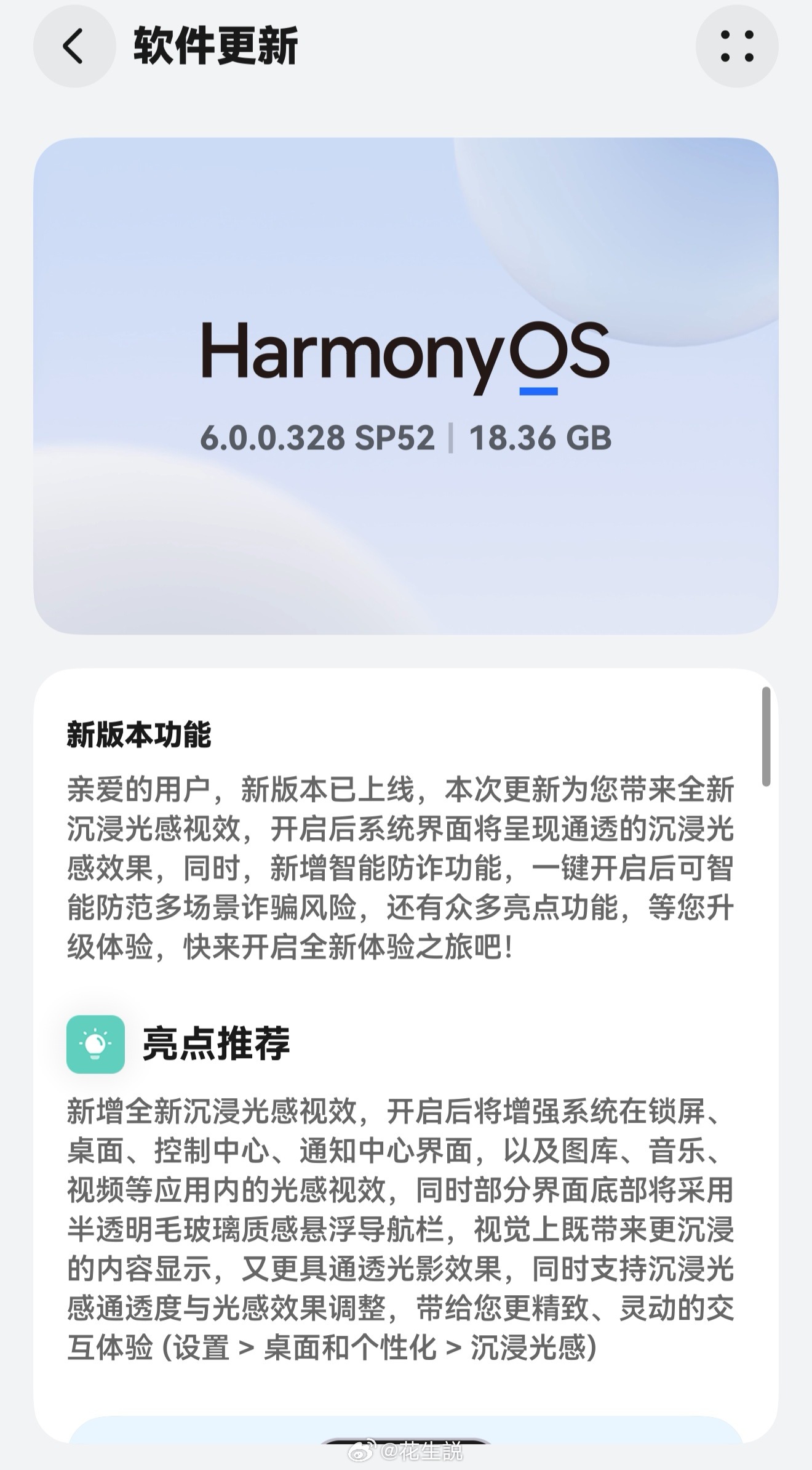 各位有在手机上见到这么大的更新包吗,华为最新系统足足18个G更新内容也很多啊,其中最主要的是全新的沉浸光感视效,更新完后在很多系统应用内也变成这种悬浮式的导航栏,整个页面看上去十分简洁,而且不遮挡内容,显示的东西也变多了大家喜欢这种设计吗