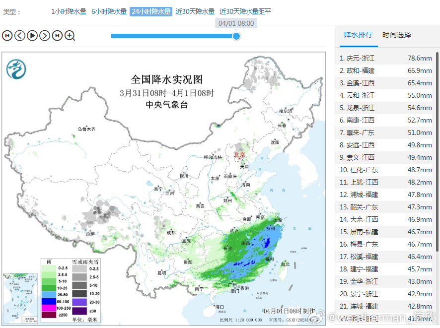 【降水和对流】昨天到今晨,江南华南多地出现了大范围对流降雨。浙江福建江西广东部分站点出现暴雨,并伴随短时强降雨,局地雷暴大风冰雹。今天江南华南大部地区的降雨处于暂停阶段。但今夜从重庆贵州一带降雨会再次发展起来,4月2-4日南方还有一轮大范围强降雨和强对流天气过程。2日晚-3日晨最强,4日减弱南压。