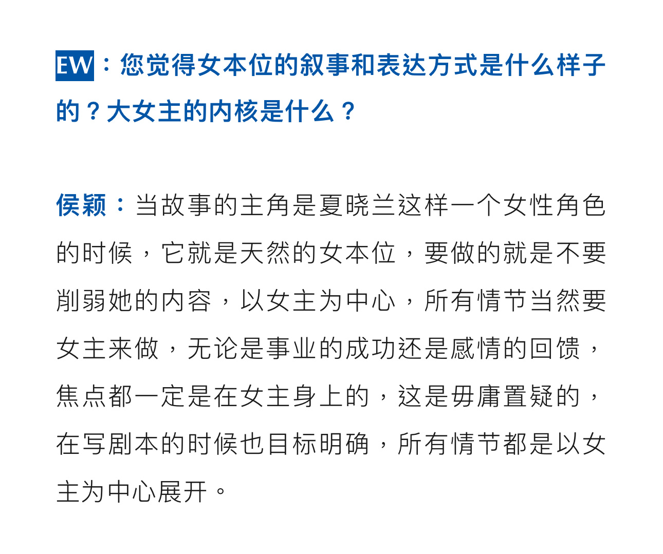 “天然的女本位,要做的就是不要削弱她的内容,以女主为中心,所有情节当然要女主来做。”