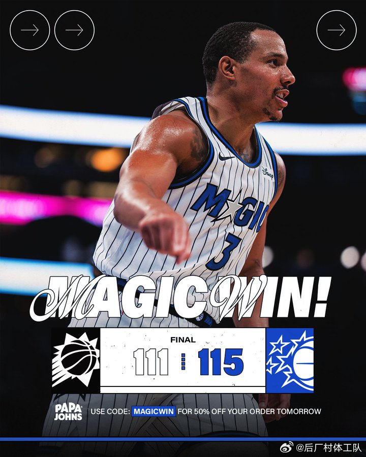 魔术115-111战胜太阳, 贝恩关键进球锁定胜局,同时湖人提前锁定季后赛。数据方面,贝恩21分6板5助、萨格斯20分8板7助4断、班凯罗19分9板8助;太阳方面,布克34分3板7助、奥尼尔14分9板4助、弗莱明11分4板。