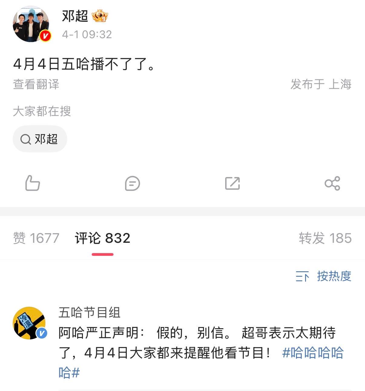 邓超官宣五哈定档五哈节目组打假邓超 愚人节还没过完,邓超就被自家节目组打假了。他说“播不了”是假,阿哈说“假的别信”是真,最后4月4日定档也是真。超哥你下次能不能直接一点,别让我们在愚人节心惊肉跳的。反正结论收到了:4月4日,五哈开播,不见不散。