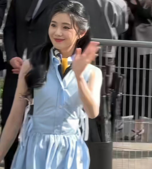 刘浩存亮相巴黎时装周MiuMiu秀场 她穿着淡蓝色无袖挖腰连衣裙,搭配彩色丝巾与棕色托特包,长发半扎成温柔的侧卷,在巴黎街头的人群里格外亮眼。 面对镜头,她笑着挥手致意,清甜灵动的模样像从画报里走出来的少女,把法式慵懒和东方少女感揉得恰到好处