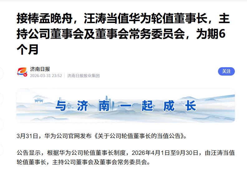 据了解,3月31日,华为方面出现了新的人事变动。即根据公司的轮值董事长制度,汪涛将接棒孟晚舟,在2026年4月1日~2026年9月30日这一区间内成为华为的轮值董事长,主持公司董事会及董事会常务委员会。