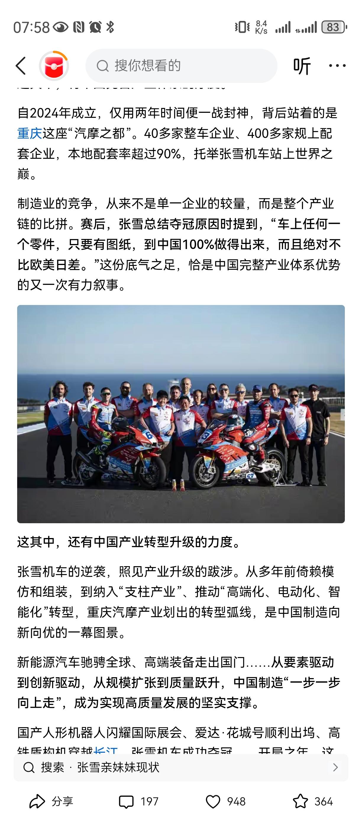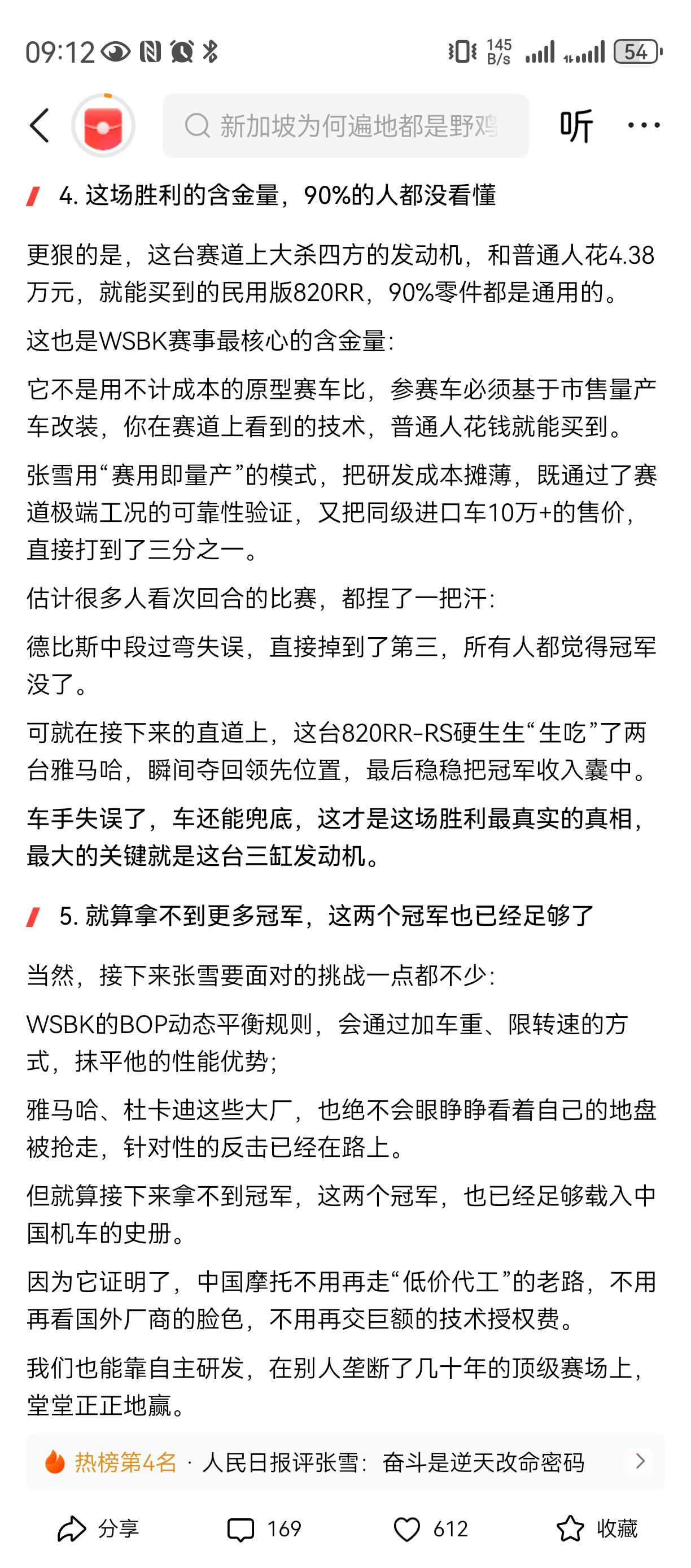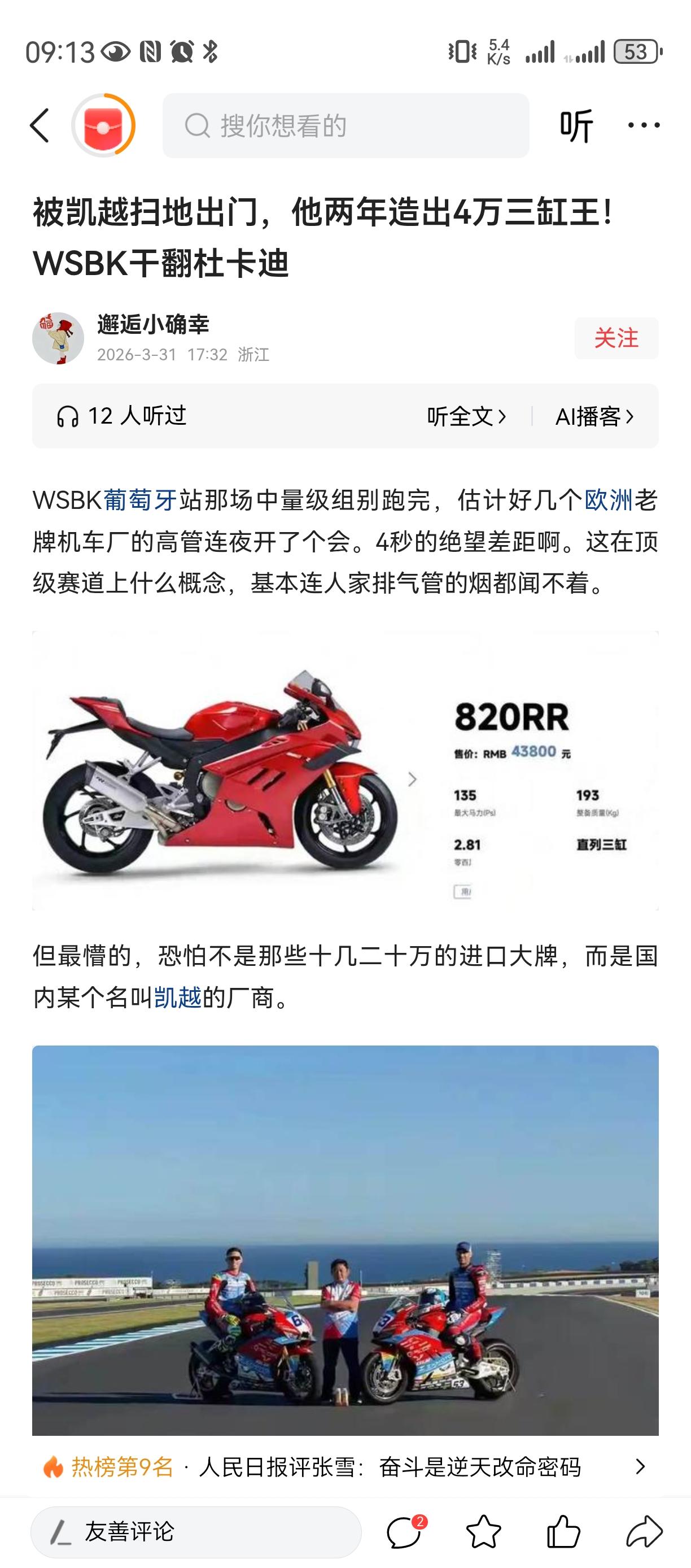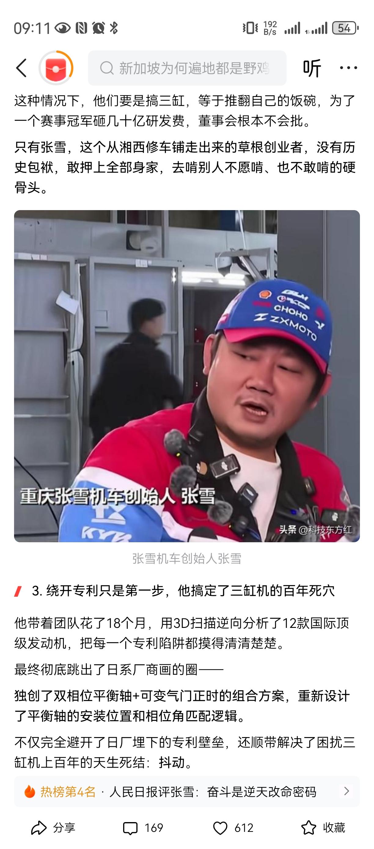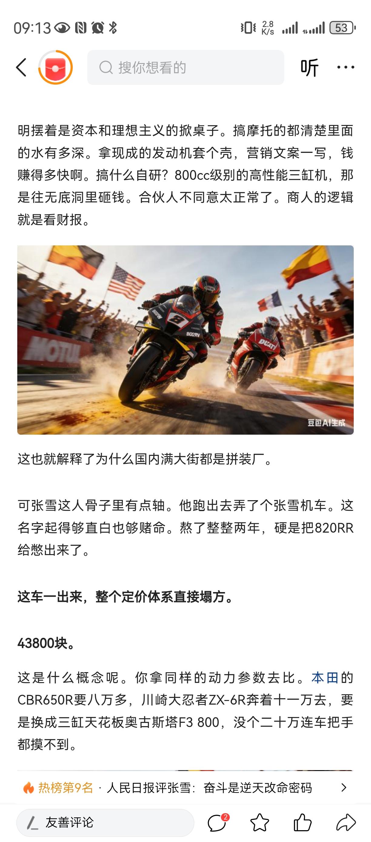 兴趣是最好的老师[赞][赞][赞]张雪表演 初中生张雪, 典型农村的穷小子, 又穷又哭还没文凭, 但就是凭借一个兴趣, 外加一个坚持不懈的恒心与闯劲, 把欧日垄断了几十年的摩托车优势扭转, 体现了了中国制造, 有血有肉不虚头巴脑 点赞点赞[赞][赞][赞] 人民日报都表扬了[啤酒][啤酒][啤酒]