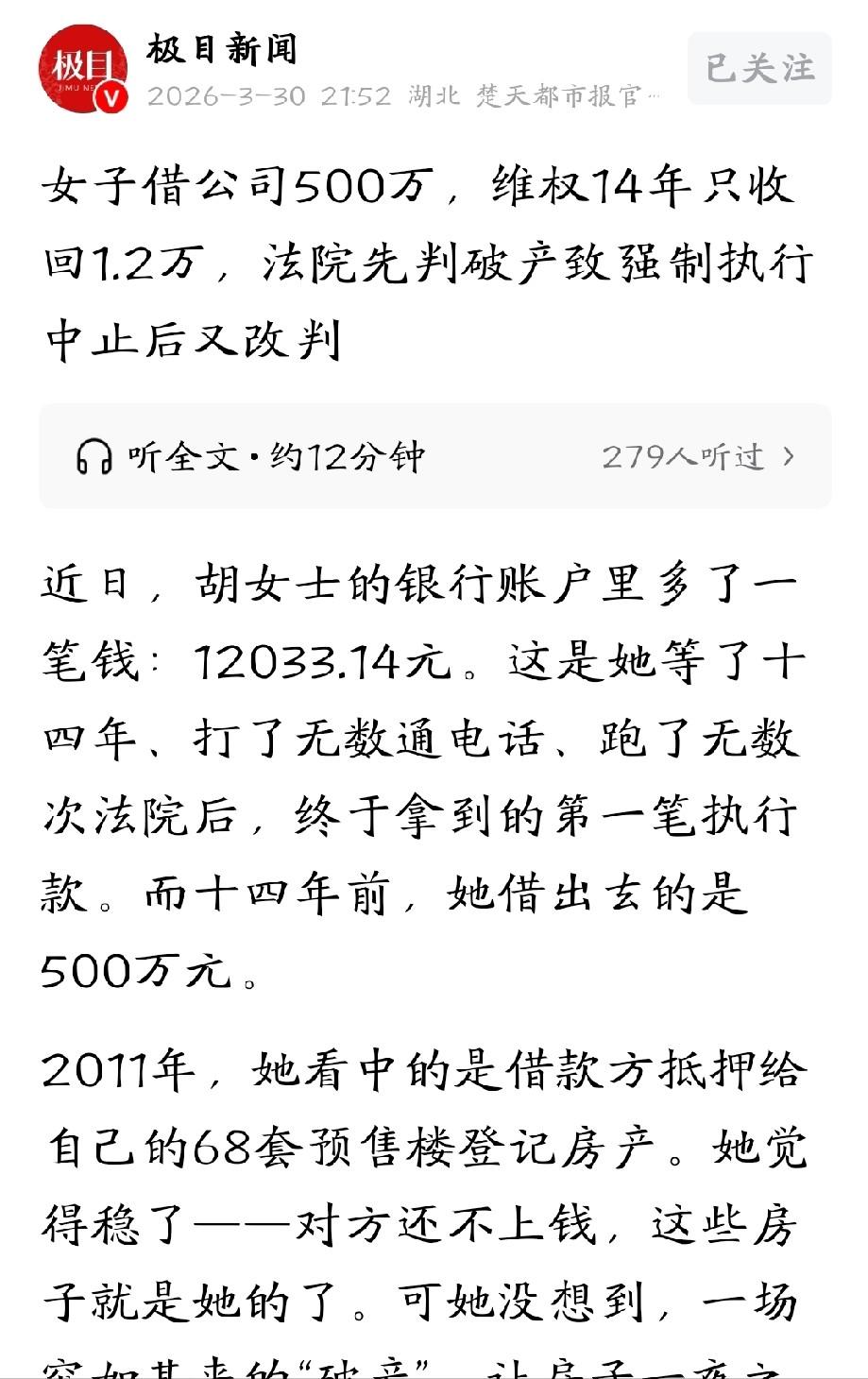太讽刺了!黑龙江大庆,女子一时冲动,将全家的500万血汗钱借给某房地产公司,对方承诺四个月就还,给20万利息,要是还不上,就用68套房子做抵押。谁知,借款到期后,对方丝毫没有还钱的意思,以各种理由一拖再拖。多次索要无果后,女子急疯了,将地产公司告上法庭。就在她准备申请强制执行时,公司突然宣布破产,68套房子没了。女子不甘心,一路为自己讨要说法,苦苦维权14年,可结果让她泣不成声。 这事发生在2011年,当时37岁的胡女士,手里攥着全家的全部家底——500万现金。这笔钱来之不易,是她父母一辈子起早贪黑做生意,一点点攒下来的辛苦钱,也是家里的全部底气。 胡女士看着这笔钱,心里一直琢磨着怎么让钱生钱,既想让自己的生活宽裕点,更想给年迈的父母攒足养老钱,让他们能安享晚年。 经身边一位熟人介绍,胡女士认识了当地某房地产公司的负责人。对方一见到胡女士,就表现得十分热情,一番寒暄后,直接开口提出要借500万。 还拍着胸脯给出了十分诱人的承诺:只用借四个月,到期就还,还额外给20万利息,折算下来,四个月的收益率就有4%,比当时银行定期存款利息高出好几倍。 怕胡女士不放心,对方还主动承诺,要是到期还不上钱,就用公司正在开发的68套房子做抵押,每套房子的位置都不错,周边配套也齐全,就算真的违约,把房子折价卖掉,也绝对能抵得上500万本金,不会让胡女士吃亏。 胡女士被这个条件打动了,翻来覆去盘算了好几夜。她算了一笔账,500万放银行,四个月的利息也就几万块,可借给这家地产公司,四个月就能赚20万,相当于普通人好几年的工资。 而且对方还有68套房子做抵押,怎么看都是稳赚不赔的买卖,再加上有熟人介绍,她也就没再多想。 为了保险起见,胡女士还特意跑了好几趟相关部门,花了不少时间,专门办了预售楼登记,把那68套抵押房子的相关手续办得明明白白,就怕后期出问题,毕竟这是全家的血汗钱,容不得半点马虎。 手续办完后,她咬咬牙,把父母的养老钱、甚至向亲戚借来的钱,全部凑在一起,一次性把500万打给了这家房地产公司。 四个月的时间很快就到了,胡女士满心期待地等着对方还钱,可左等右等,连对方的人影都见不到,电话打过去,要么没人接,要么就是以“资金周转不开”“工程还没回款”为由,一拖再拖。 胡女士心里开始发慌,赶紧找到地产公司的办公地点,结果发现公司大门紧闭,只剩下几个工作人员在收拾东西,一问才知道,公司的资金早就出现了问题。 多次索要无果后,胡女士彻底急疯了,这可是全家的身家性命,她不能就这么算了,当即决定将这家房地产公司告上法庭。 法院很快就做出了判决,判定胡女士胜诉,还查封了当初承诺抵押的68套房子,明确表示,要是对方还不上钱,就把房子折价或者拍卖,用来抵偿500万本金和利息。 拿到判决书的那一刻,胡女士悬着的心终于放了下来,她以为自己的血汗钱总算有着落了,可就在她准备申请强制执行,拿回属于自己的钱时,意外发生了。 这家房地产公司突然宣布破产,法院也受理了公司的破产清算申请,当初查封的68套房子,也被纳入了破产清算的财产范围。 更让胡女士崩溃的是,她后来才知道,这家房地产公司早在2011年4月,就已经被吊销了营业执照,却还在继续对外借款、开发楼盘,属于违规经营。 而且在破产清算时,她还发现,公司早就背负了巨额债务,除了她的500万,还有其他多个债权人的欠款,总金额高达数千万。 接下来的日子,胡女士开启了漫长的维权之路。这一维权,就整整坚持了14年。这14年里,她几乎放下了自己的所有生活,每天不是在法院、破产清算组之间奔波,就是在整理各种证据。 期间,事情也曾出现过一丝转机。2022年12月,法院突然撤销了当年的破产裁定,理由是当初的审计报告数额不准,公司到底资不抵债还不一定,胡女士再次燃起希望,以为能拿回自己的钱。 可没想到,等她去申请查封那68套房子时,才发现其中61套早就被公司在破产期间违法卖掉了,只剩下7套还能预查封。 更糟的还在后面,就在她准备处置这7套房子时,又冒出几个案外人,拿着购房合同声称,这7套房子早在胡女士查封之前,就已经被他们买走了,导致处置程序只能暂停。 直到2025年5月,胡女士终于收到了法院的裁定书,上面写着终结本次执行程序,法院从地产公司的账户里,只扣划了12115.14元,扣除82元执行费后,最后到她手里的,只有12033.14元。 从37岁等到52岁,14年的青春,500万的血汗钱,最后只拿回1.2万,这样的结果,让她当场泣不成声。 如今,胡女士还没有放弃,她把所有的证据都整理好,准备继续通过法律途径维权,哪怕希望渺茫,她也想为自己、为家人讨一个说法。 信源:极目新闻