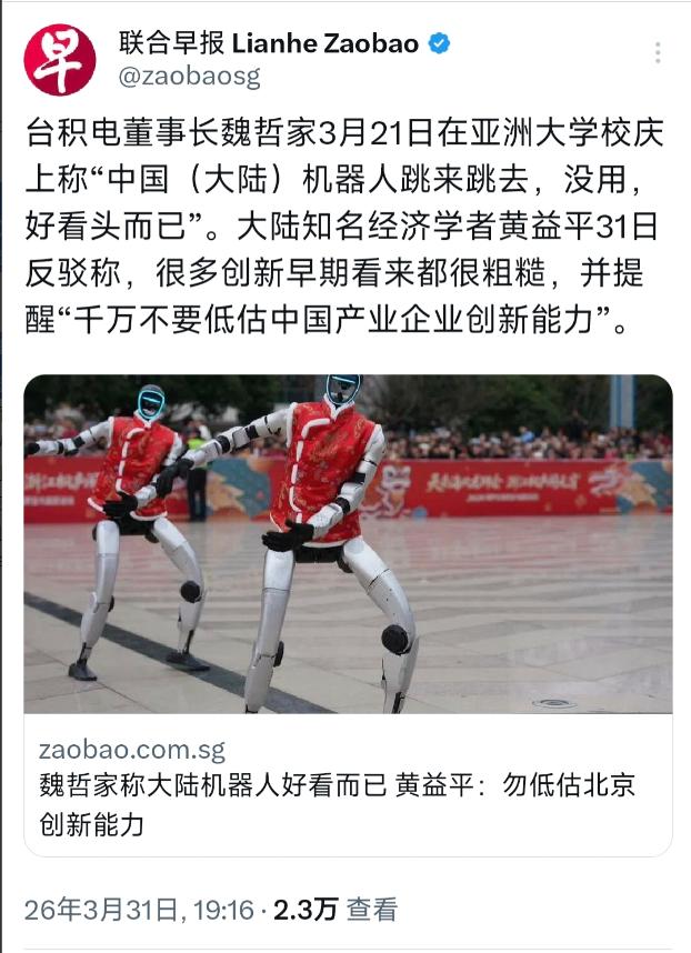 新加坡联合早报今晚(3月31日晚)报道:“台积电董事长魏哲家3月21日在亚洲大学校庆上称‘中国(大陆)机器人跳来跳去,没用,好看头而已’。大陆知名经济学者黄益平31日反驳称,很多创新早期看来都很粗糙,并提醒‘千万不要低估中国产业企业创新能力’。” 魏哲家嘲讽大陆机器人“跳来跳去只是好看”,这一观点尽显行业傲慢,更是对技术发展规律的全然漠视。 魏哲家这话,说好听点是行业大佬的直率点评,说难听点就是典型的“站在产业链顶端看下面,啥都看不上眼”的傲慢。 他可能忘了,台积电今天的江湖地位,离不开大陆市场的滋养,更离不开全球产业链的协作。现在倒好,翅膀硬了,就开始对下游产业指手画脚,这吃相未免太难看。 更有意思的是,就在魏哲家说这话的当口,大陆机器人产业正悄悄憋大招。3月29日,广东刚启用了全国首条年产能万台级的人形机器人生产线,平均每30分钟就有一台机器人下线。 3月30日,智元机器人宣布第10000台通用具身机器人远征A3正式下线,从5000台到10000台,人家只用了3个多月。这些实打实的产能数据,难道都是“好看头”? 还有春晚那个《武BOT》节目,几十台人形机器人跟武术演员同台,后空翻、跳马、耍双节棍,动作行云流水,跑位速度比去年快了5-10倍。 魏哲家要是看了,估计得说“这都是花架子”。可他不知道的是,这些“花架子”背后,是运动控制、传感器融合、AI算法的综合体现,没有这些基础技术,别说跳舞,连走直线都难。 再说了,机器人会跳舞怎么就没用了?当年无人机刚出来的时候,不也只是用来拍个照、搞个表演吗?现在呢?农业植保、物流配送、应急救援,哪儿都少不了它。 机器人跳舞,本质上是在秀肌肉——秀的是运动控制能力,秀的是多机协同技术,这些都是未来工业、服务机器人的核心竞争力。今天能跳好舞,明天就能在工厂里精准抓取零件,在医院里辅助手术,在家庭里照顾老人,这逻辑很难懂吗? 魏哲家可能觉得,只有装了台积电高端芯片的机器人才算有“大脑”,才算真有用。这话没毛病,但也太片面了。芯片重要,算法、机械结构、传感器同样重要,缺了哪一样,机器人都玩不转。 大陆企业现在确实在高端芯片上还有短板,但这不代表我们就只能搞“好看头”。就像黄益平说的,创新都是从粗糙开始的,今天的“跳来跳去”,就是明天“干大事”的基础。 更别提那些已经在工业现场默默干活的机器人了。汽车工厂里的焊接机器人、电子厂的装配机器人、物流仓库的分拣机器人,这些机器人不跳舞,不表演,就埋头干活,难道这些也都是“没用”的?据统计,2026年至今,大陆机器人领域已经完成了190多起融资,金额超200亿元,资本的眼睛是雪亮的,要是真没用,谁会砸这么多钱进去? 魏哲家作为半导体行业的大佬,本该有更开阔的视野,更包容的心态。技术发展不是一蹴而就的,更不是某一个环节就能独霸天下的。今天你看不起的“跳来跳去”,说不定明天就会变成颠覆你认知的“黑科技”。就像当年没人看好的新能源汽车,现在不也让传统车企瑟瑟发抖吗? 最后说句实在话,中国企业的创新能力,从来都不是靠别人的认可才存在的。当年搞高铁,有人说“引进、消化、吸收、再创新”是抄袭;当年搞5G,有人说技术不成熟,商用价值低;现在搞机器人,又有人说“跳来跳去没用”。可结果呢?高铁卖到了全世界,5G基站数量占了全球一半以上,机器人产业也正以肉眼可见的速度崛起。 黄益平的提醒很及时,千万不要低估中国产业企业的创新能力。魏哲家要是真有远见,就该好好琢磨怎么跟大陆机器人企业合作,而不是站在一旁说风凉话。毕竟,产业链是环环相扣的,你今天看不起的“小兄弟”,明天可能就变成你离不开的“合作伙伴”。