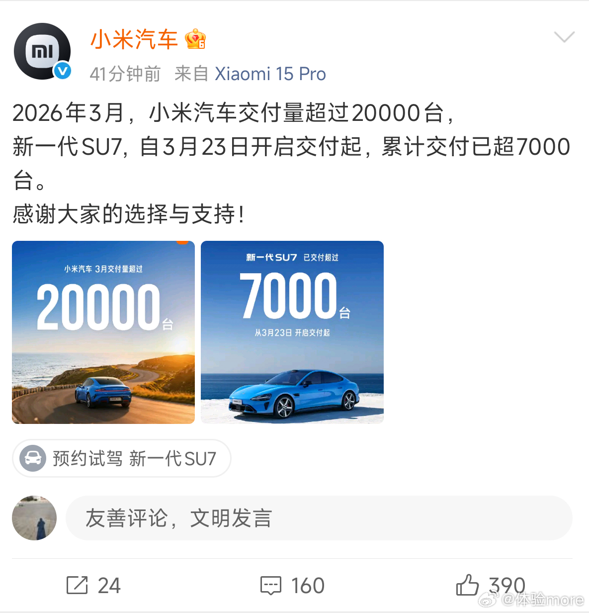3月份由于新一代SU7备产和上市,估计会影响到YU7的生产和交付。在加上26年开局新能源汽车市场面临的购置税、国补退坡、需求提前释放等问题,别家都大幅度同比下滑,小米能在3月份交付2万+已经很不错了,再接再厉。