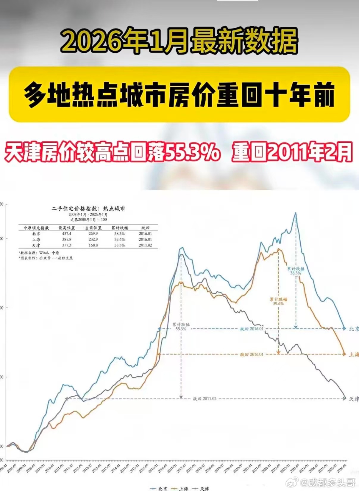 多地热点城市房价重回十年前。天津较高点回落55.3%,房价重回2011年。