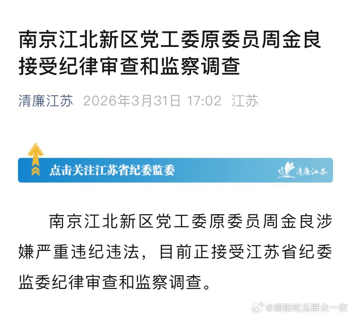 南京江北新区党工委原委员周金良接受纪律审查和监察调查。