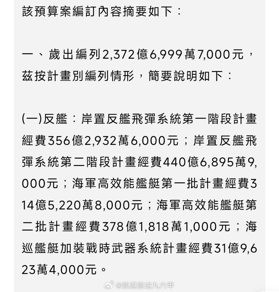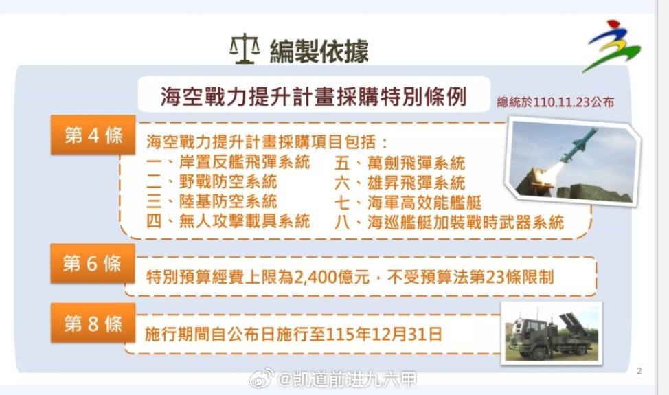 台军方面从2021年开始通过「海空戰力提升計畫採購特別預算案」,在强化反舰作战能力上已经投入了上千亿新台币,快速扩张了其反舰作战能力,雄风2/3系列反舰导弹进入持续高速量产时期。