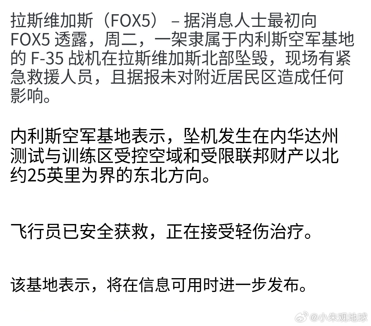 【快讯】刚刚,一架隶属于内利斯空军基地的F-35战机在拉斯维加斯北部坠毁,据福克