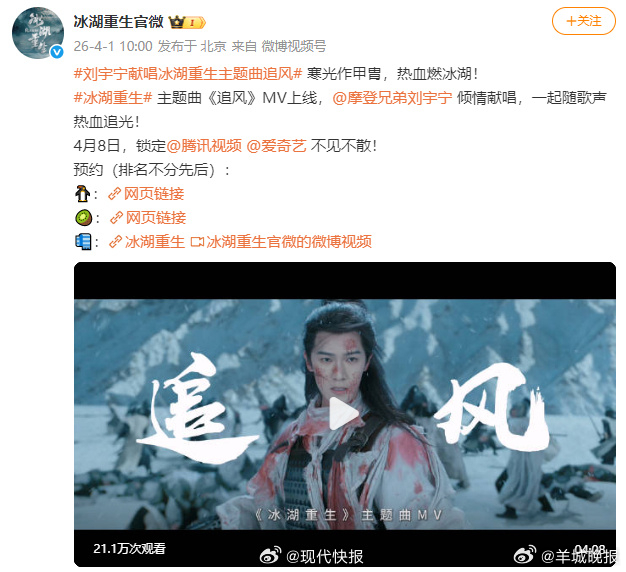 【#月鳞绮纪冰湖重生ost都有刘宇宁#】4月1日,即将开播的古装大剧《月鳞绮纪》和《冰湖重生》都发布了OST相关信息,分别献唱《冰湖重生》主题曲《追风》、《月鳞绮纪》伤逝曲《玉眠》。网友:OST主理人又来了,唱完你的唱你的!摩登兄弟(现代快报)更多消息:#站姐团建##李荣浩 抄袭##李荣浩否认抄袭##汪东城愚人节退圈##TFBOYS站姐图##宋宁峰 我也不出轨还要我怎样#(编辑:杨雨桐;审签:周乐瑞)